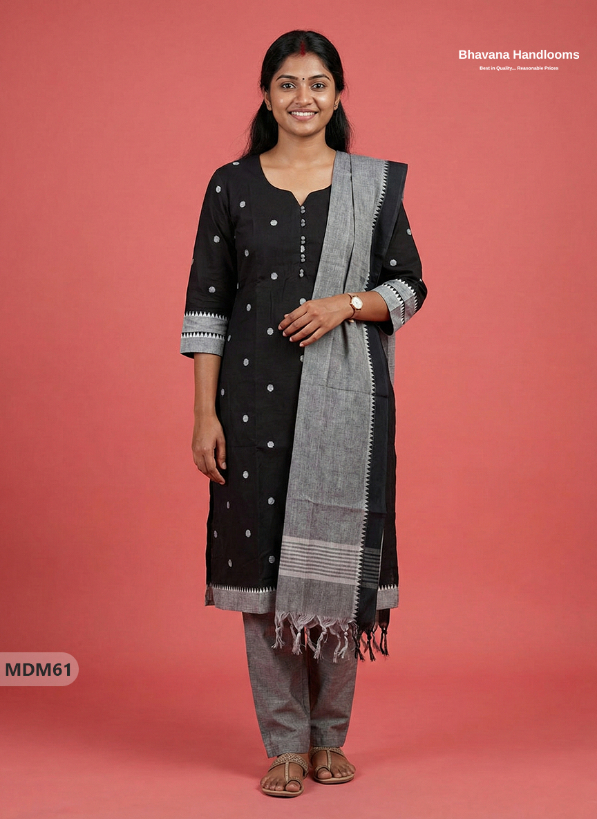 Keywords: Mangalagiri Cotton 3PC Set, Cotton Kurti Set with Dupatta, Elastic Bottom with Pocket, Bhavana Originals, Full-Length Lining Kurti Set, Handloom Cotton Suit Set.
