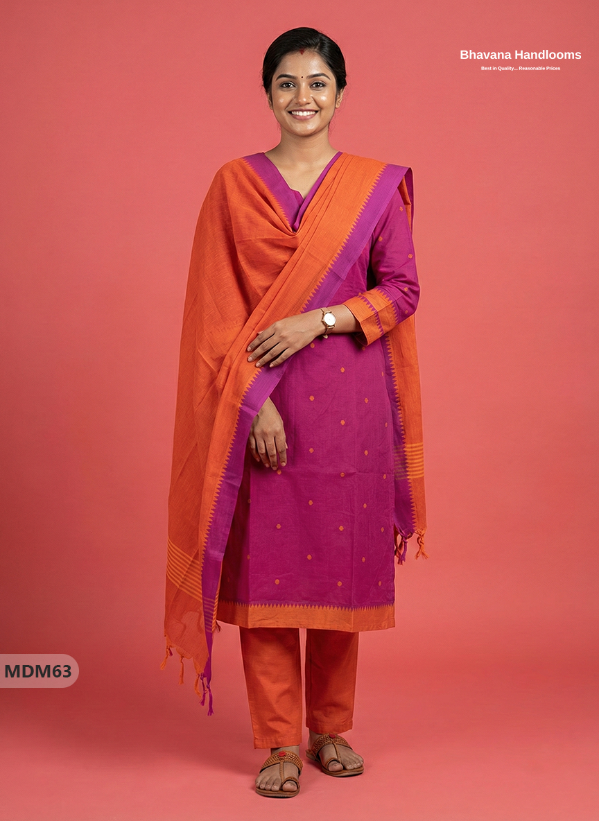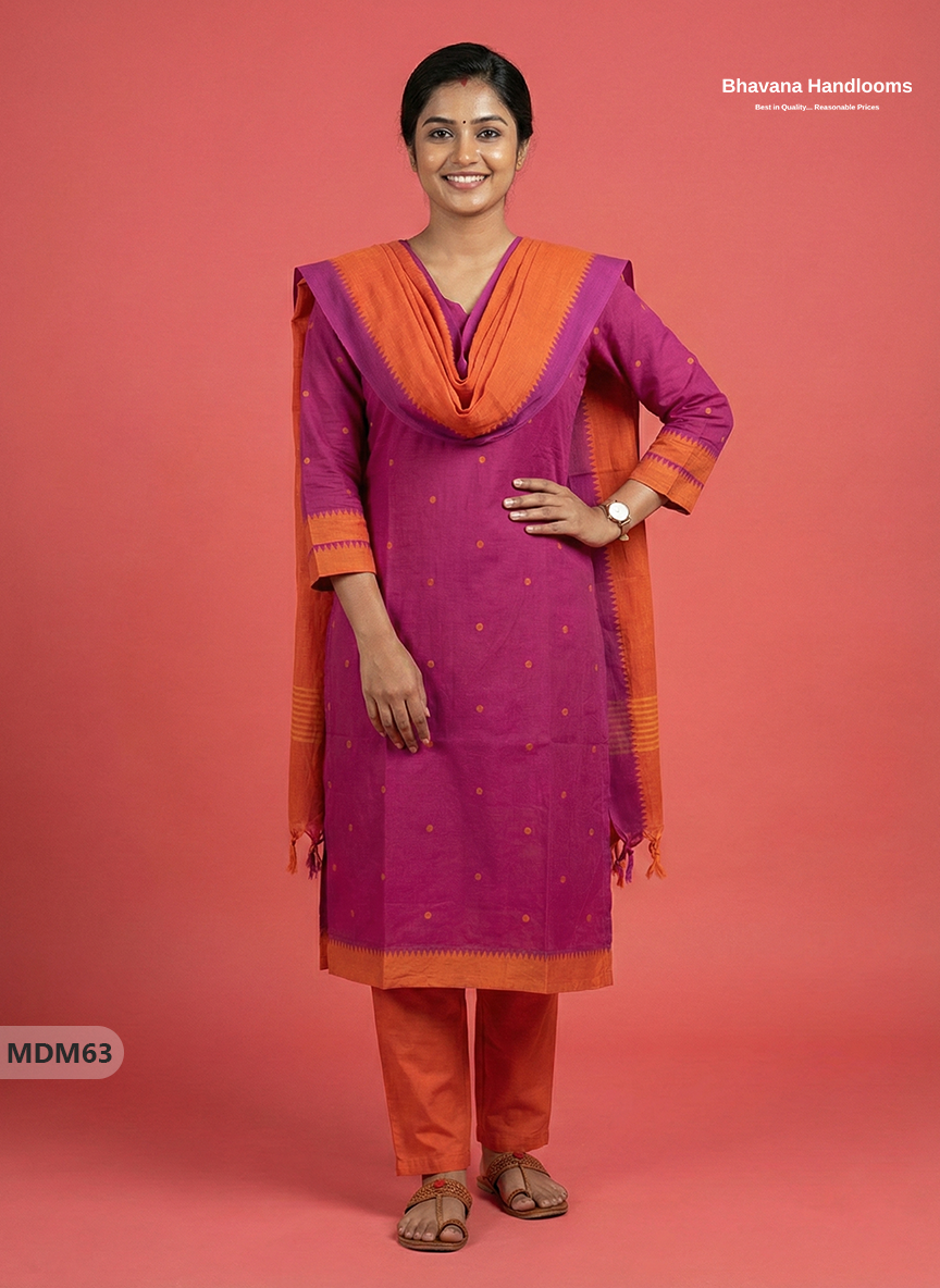 Keywords: Mangalagiri Cotton 3PC Set, Cotton Kurti Set with Dupatta, Elastic Bottom with Pocket, Bhavana Originals, Full-Length Lining Kurti Set, Handloom Cotton Suit Set.