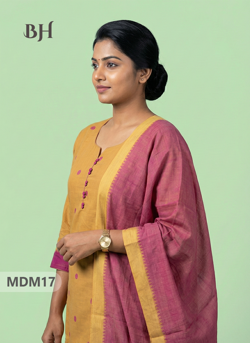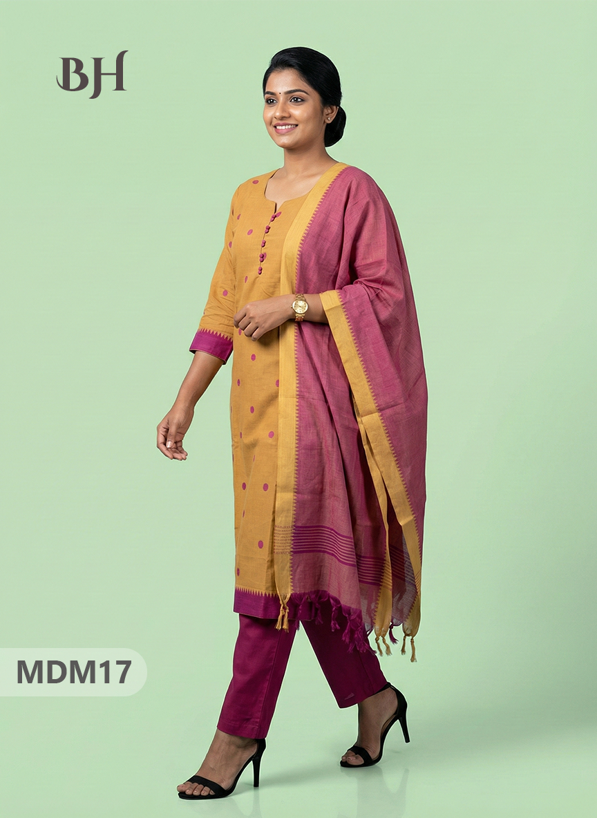Keywords: Mangalagiri Cotton 3PC Set, Cotton Kurti Set with Dupatta, Elastic Bottom with Pocket, Bhavana Originals, Full-Length Lining Kurti Set, Handloom Cotton Suit Set.