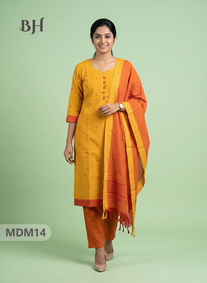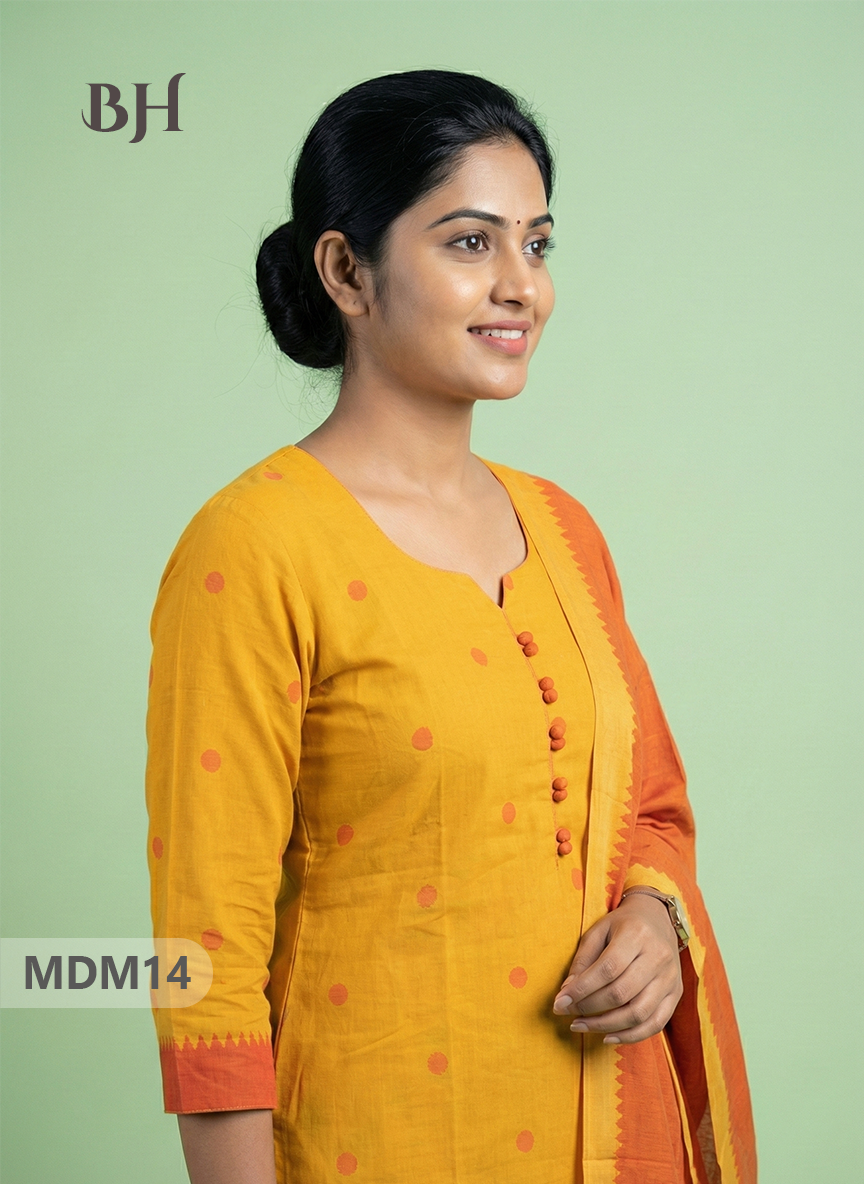 Keywords: Mangalagiri Cotton 3PC Set, Cotton Kurti Set with Dupatta, Elastic Bottom with Pocket, Bhavana Originals, Full-Length Lining Kurti Set, Handloom Cotton Suit Set.