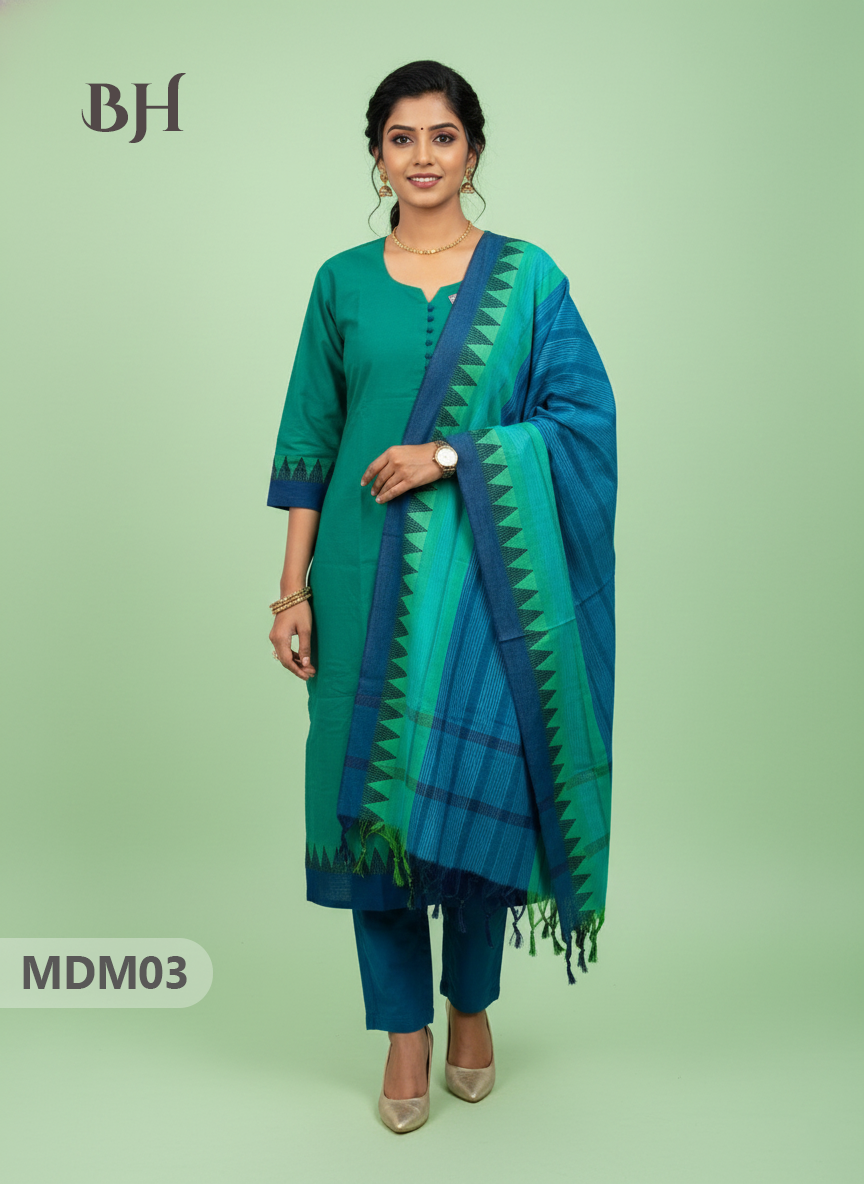 Mangalagiri Cotton 3PC Set with Full-Length Lining & Elastic Pocket Bottom – Teal & Blue Double Weave