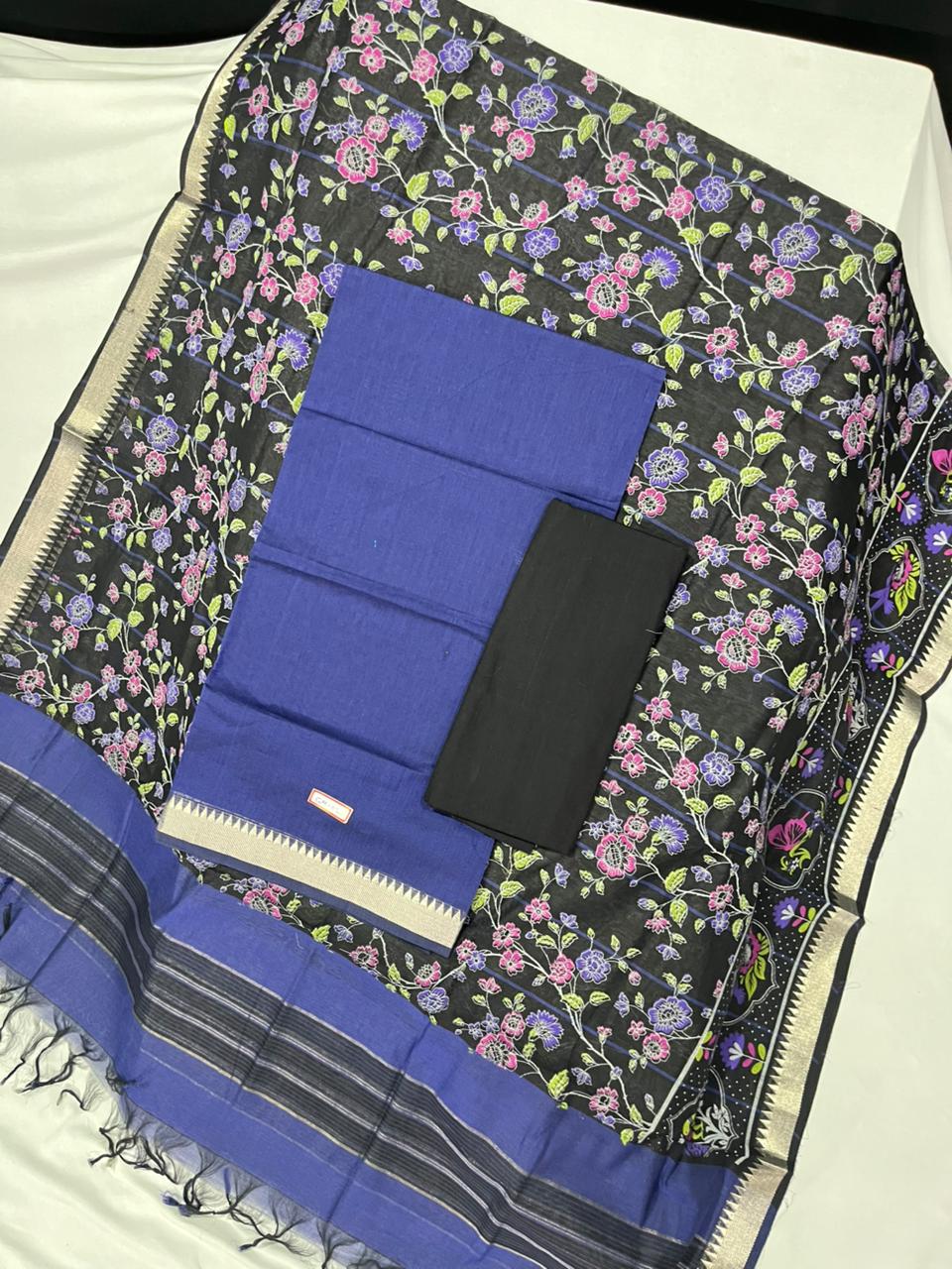 Mangalagiri Cotton Dress Material with Black Chunni with Blue Colour