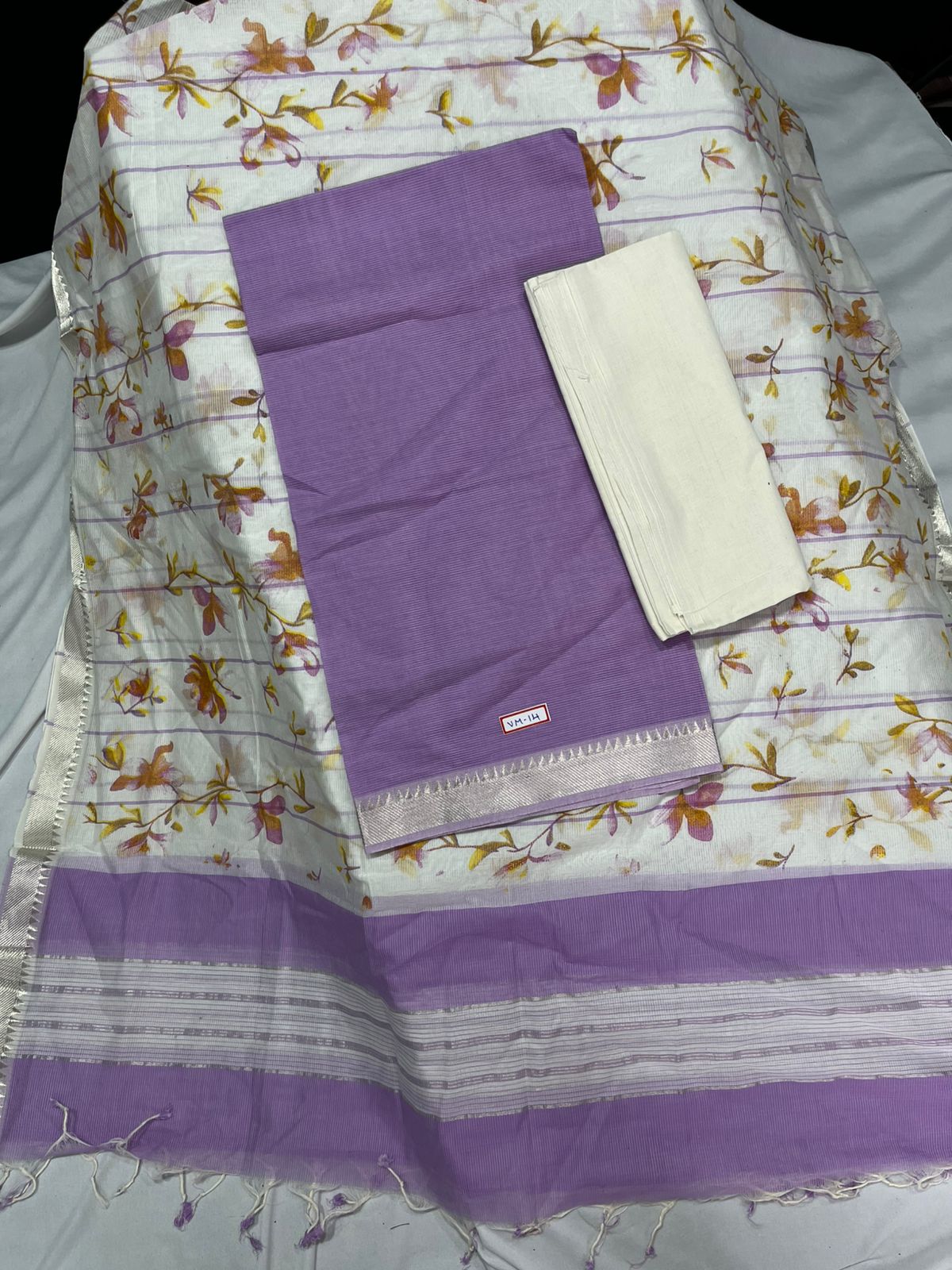 Mangalagiri Cotton Dress Material Half White with Dusty Purple Colour