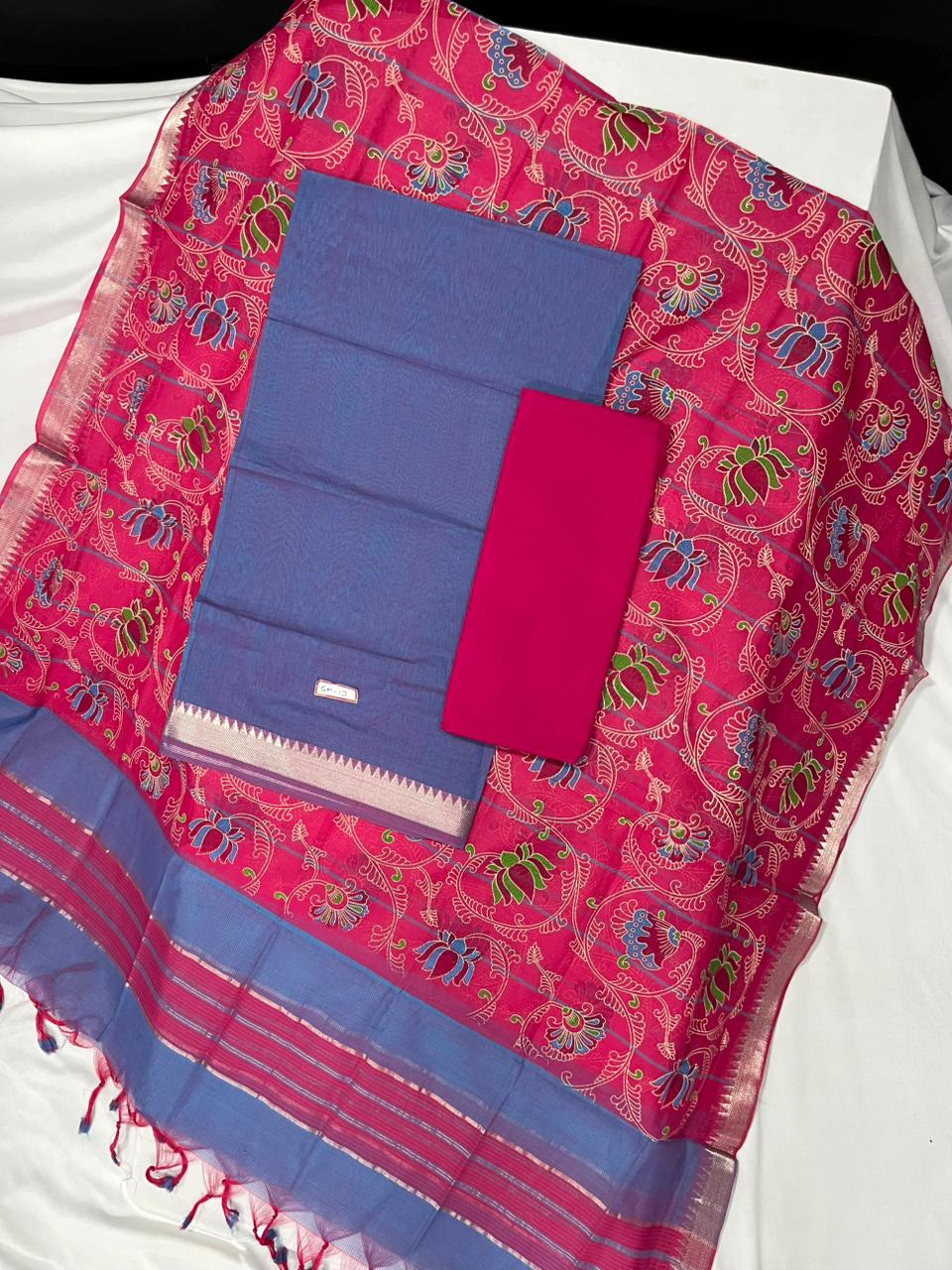 Mangalagiri Cotton Dress Material with Pink Chunni with Blue Colour