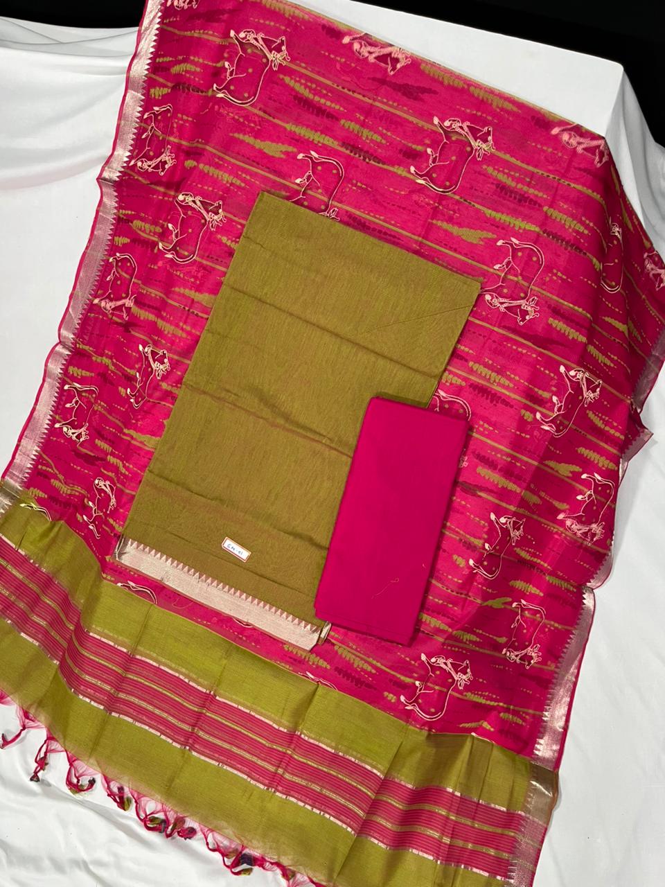 Mangalagiri Cotton Dress Material with Pink Chunni with Green Colour