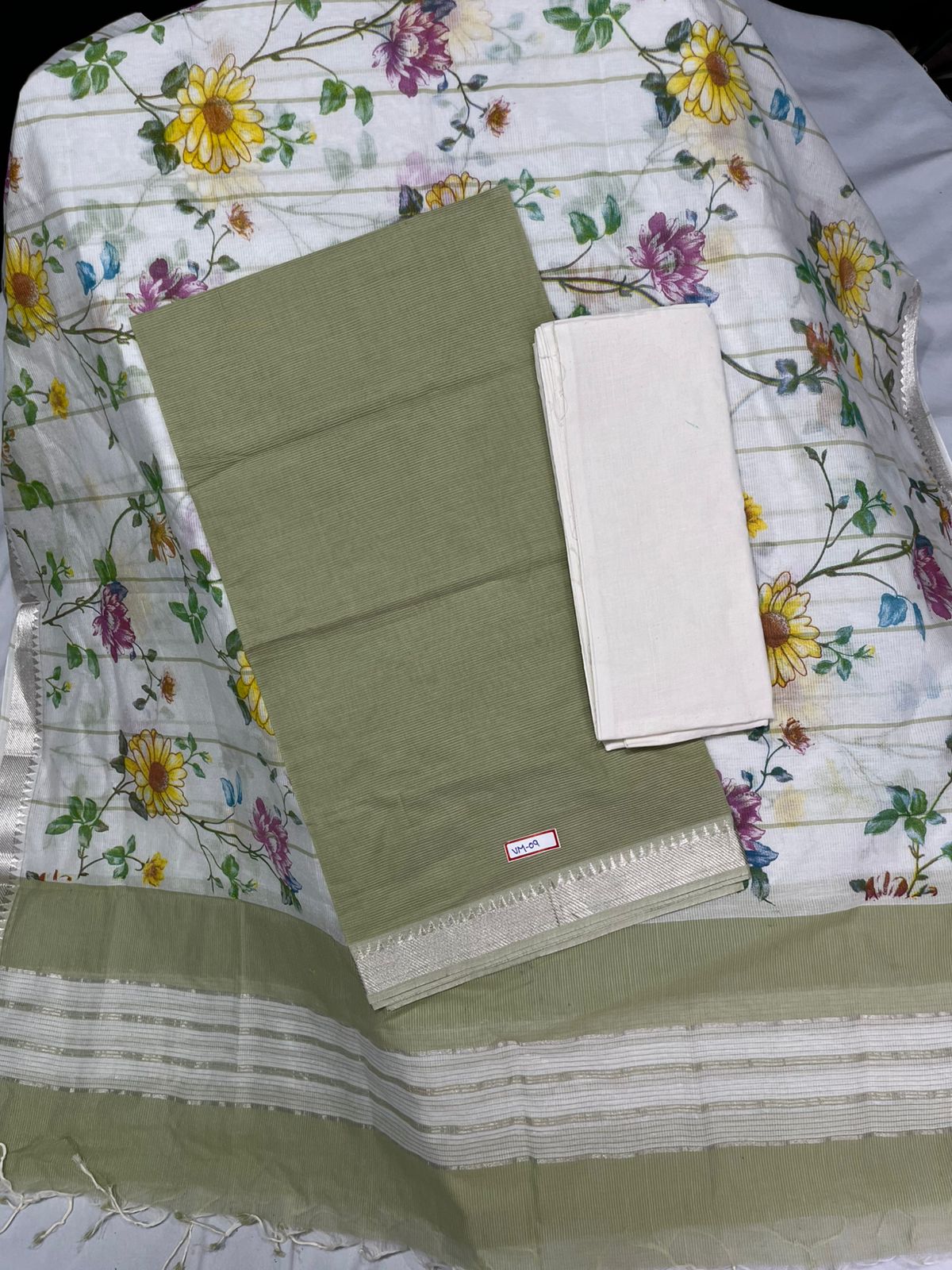 Mangalagiri Cotton Dress Material with White Chunni with Army Brown Colour