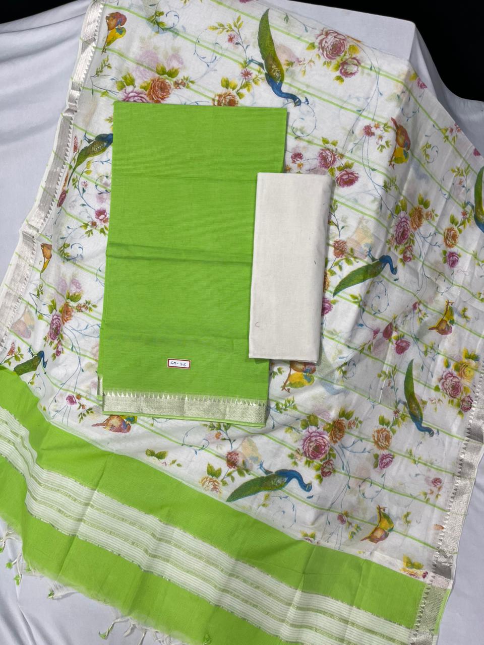 Mangalagiri Cotton Dress Material with White Chunni with Green Colour