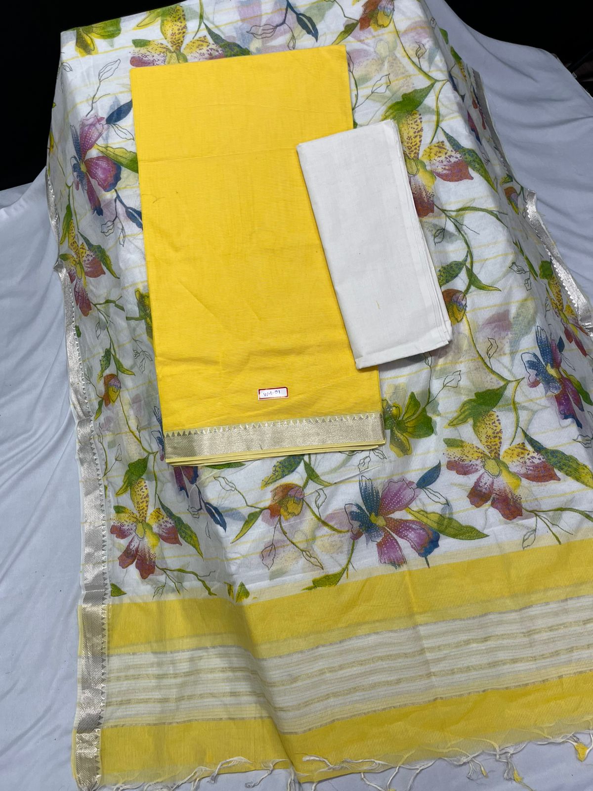 Mangalagiri Cotton Dress Material with White Chunni with Mango Yellow Colour