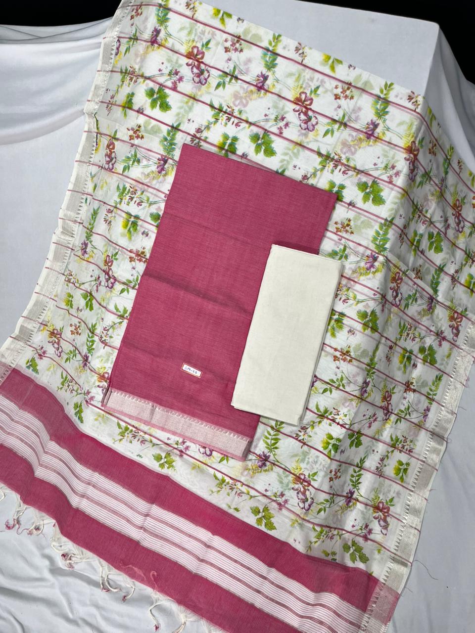 Mangalagiri Cotton Dress Material with White Chunni with Pink Colour