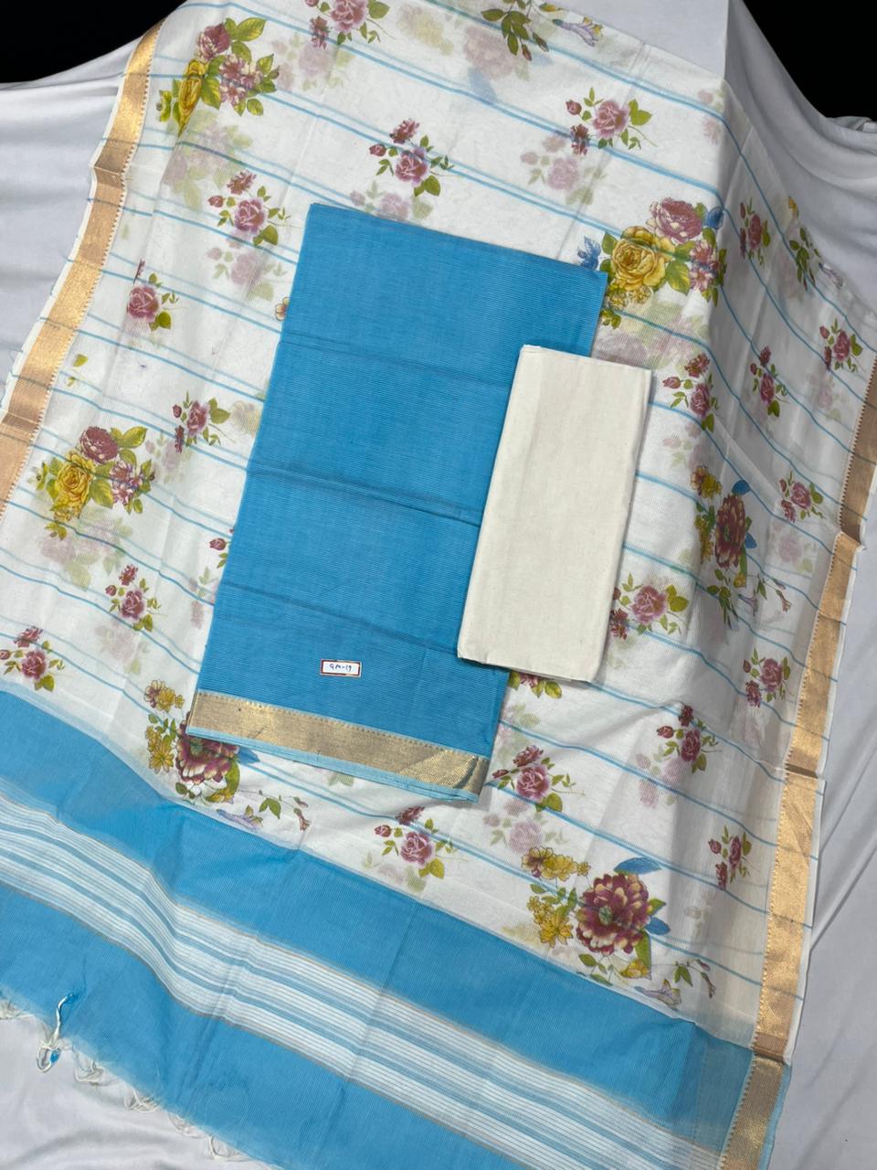 Mangalagiri Cotton Dress Material with White Chunni with Sky Blue Colour