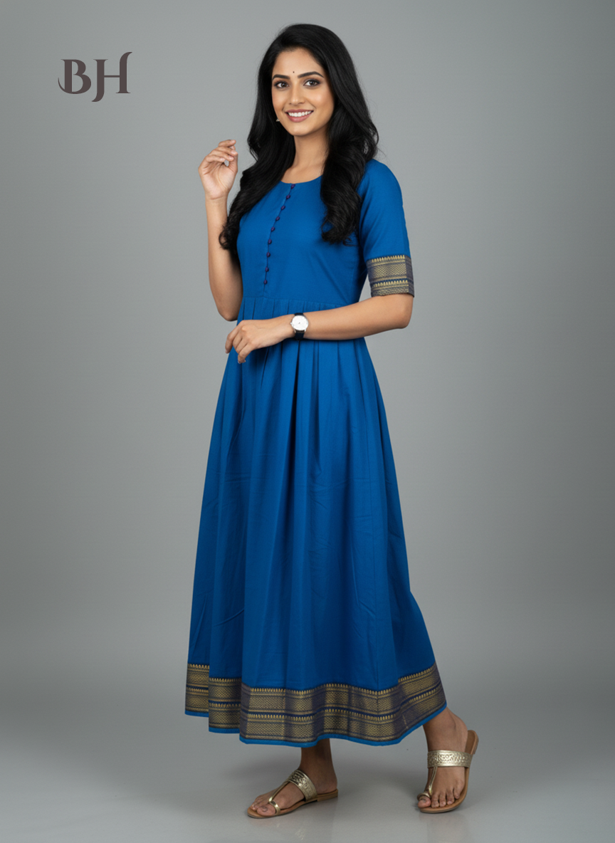 Keywords: Mangalagiri Cotton Frock, Handloom Cotton Long Frock, Bhavana Originals, Traditional Mangalagiri Frock, Half-Length Lining Cotton Frock, Women’s Handloom Dress.