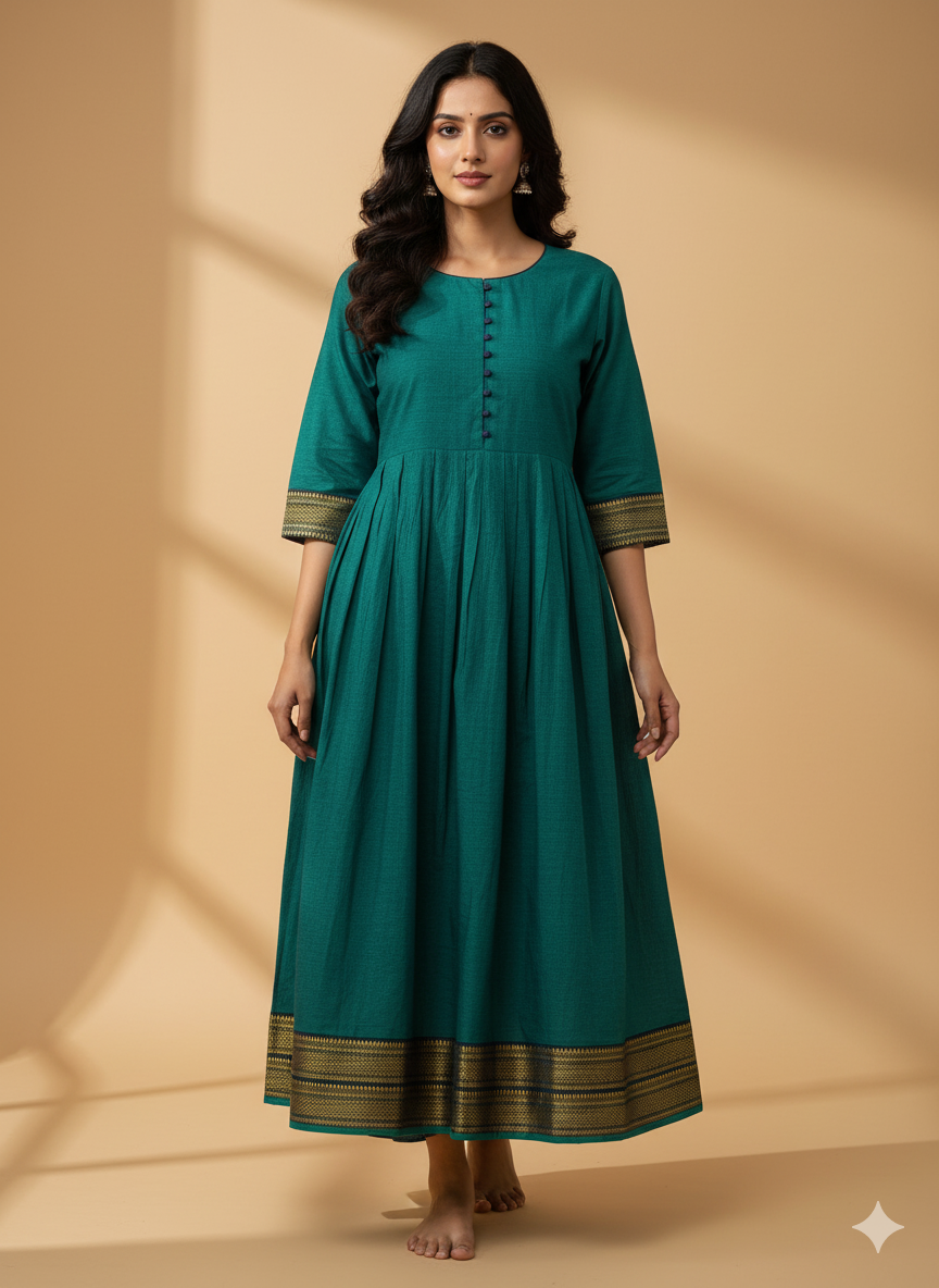 Mangalagiri Cotton Long Frock with Emrold Green Colour
