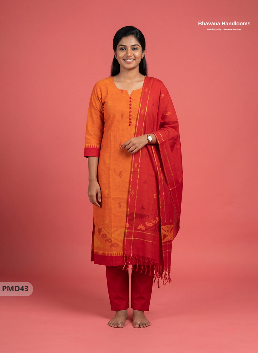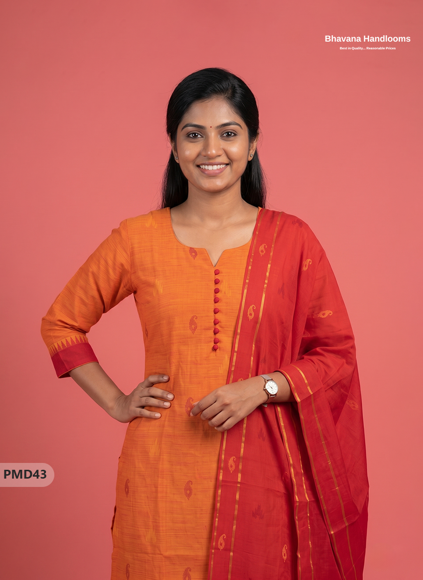 Mangalagiri Handloom Printed Cotton Suit Set with Potli Balls – Orange Colour