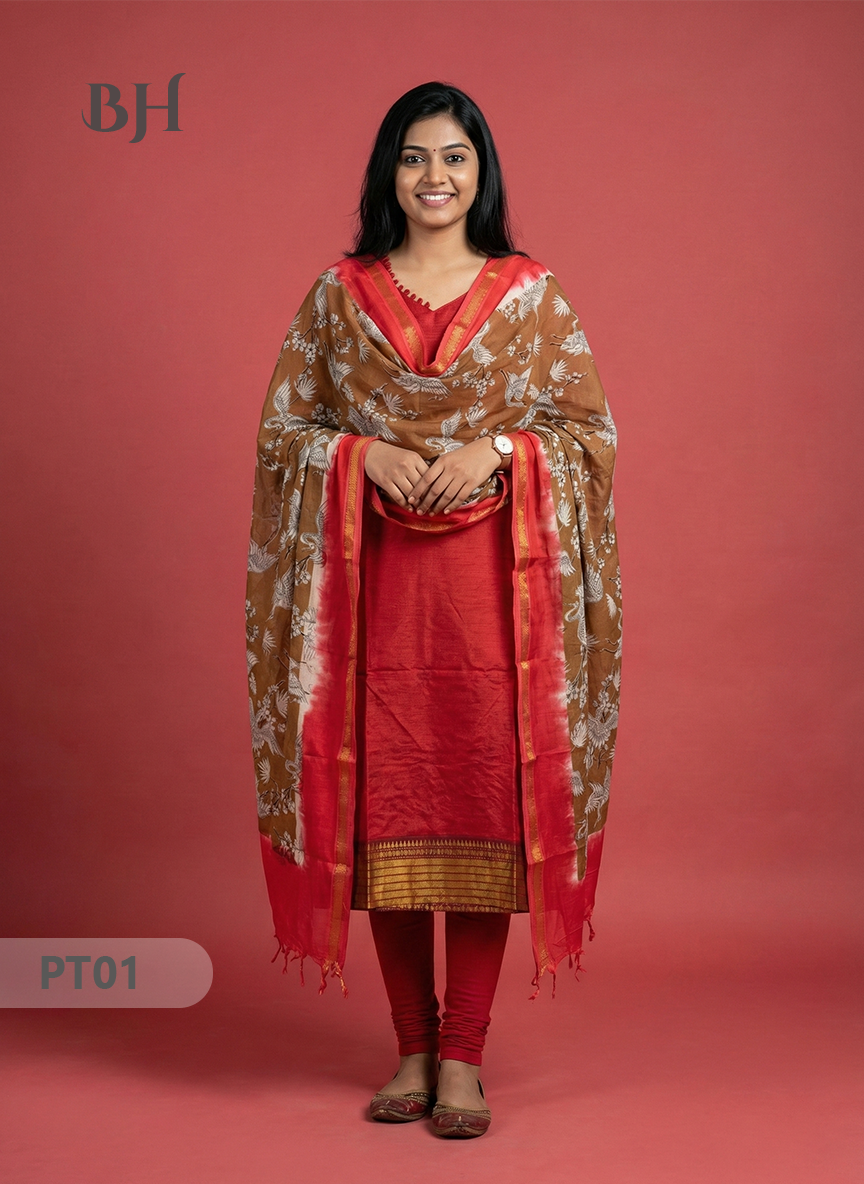 Mangalagiri Semi Pattu Dress Set in Red | 2pc Kurti with Kalamkari Semi Pattu Dupatta