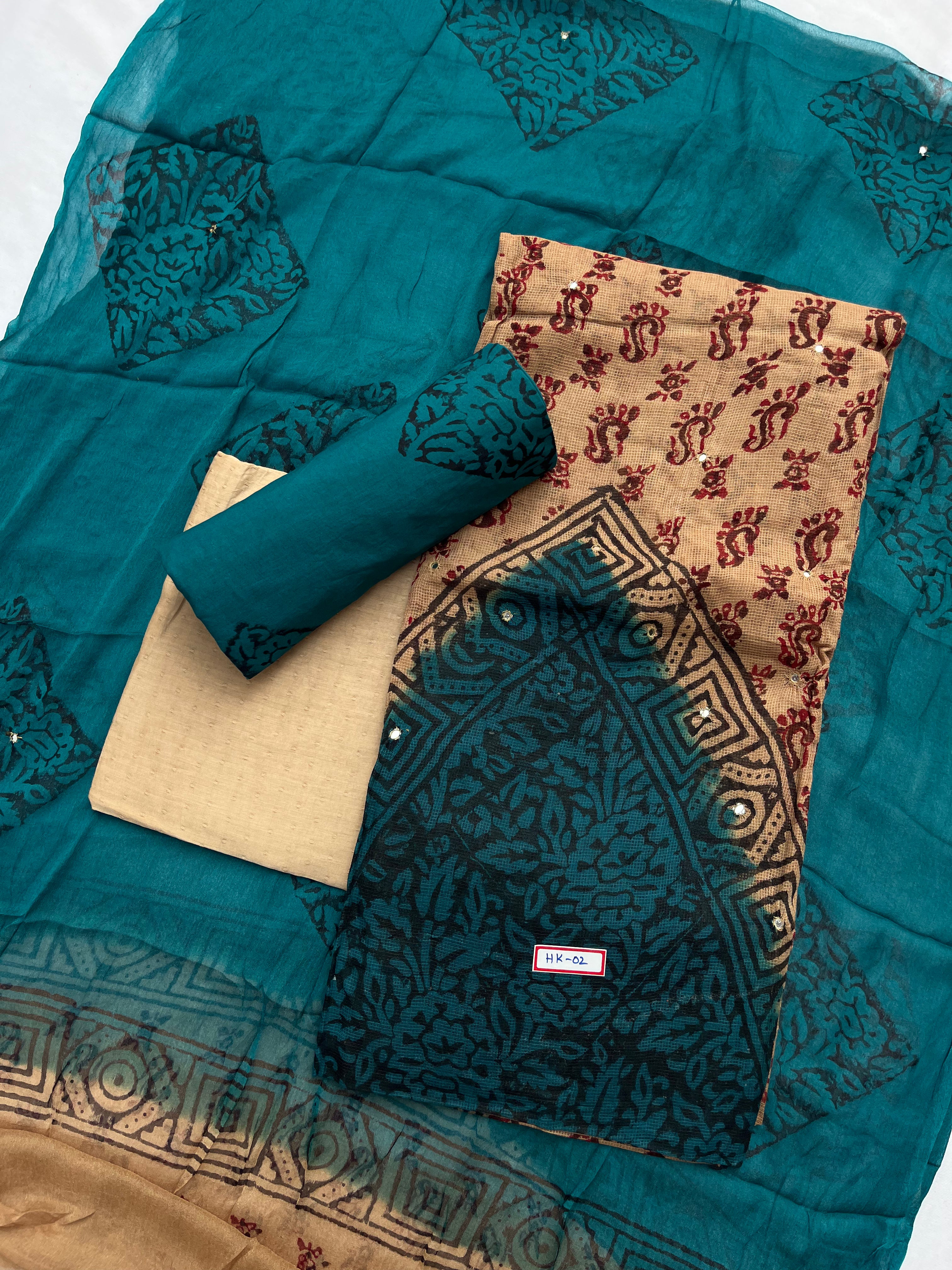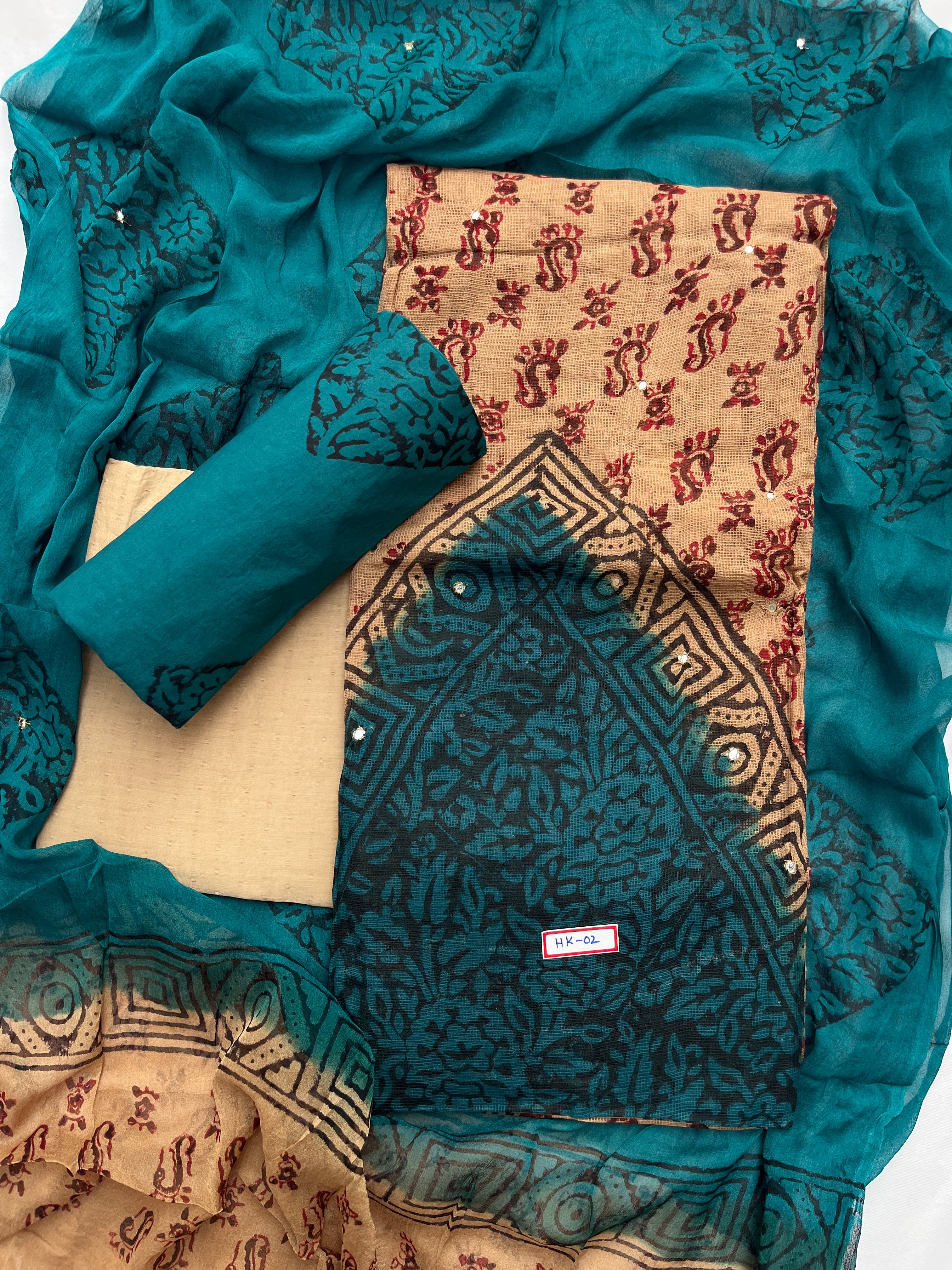 What you will get: 1 Kota Top + 1 Cotton Bottom + 1 Cotton Lining + 1 Georgette Dupatta (All Materials Only).