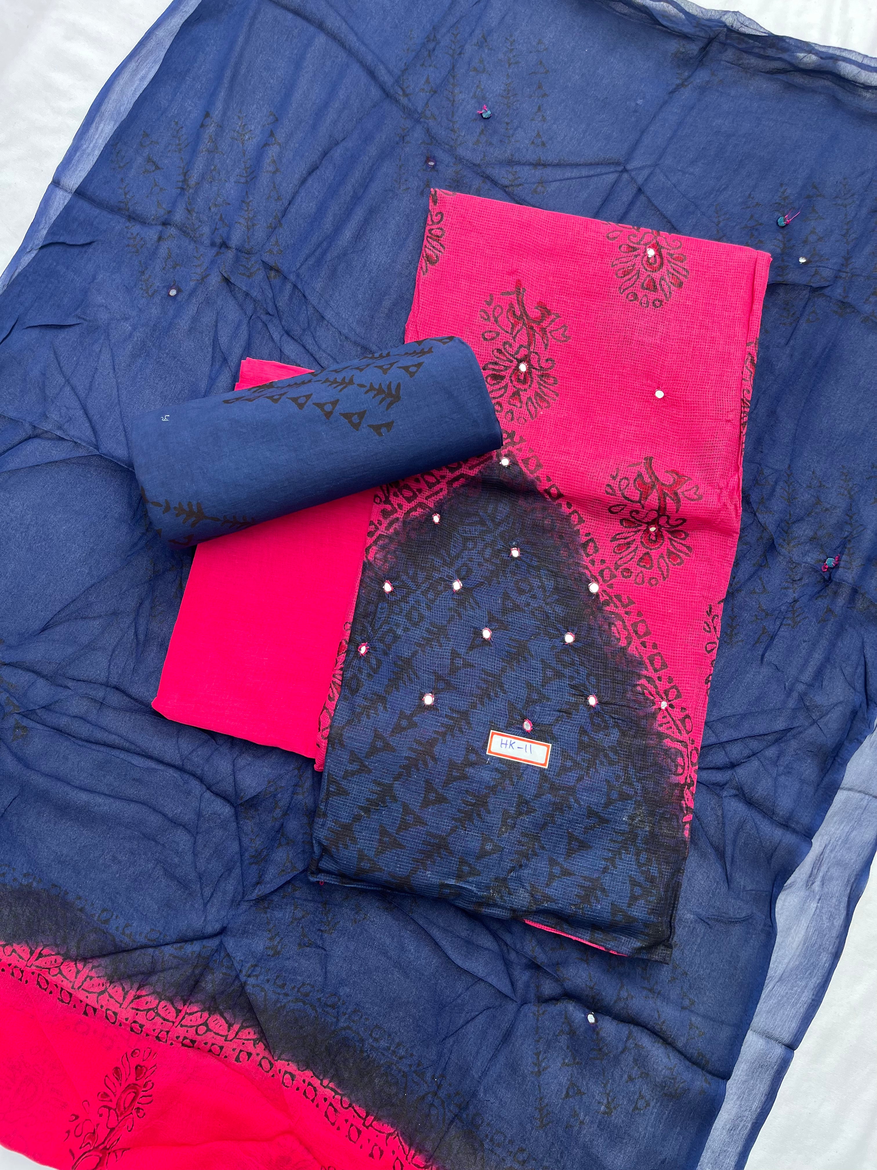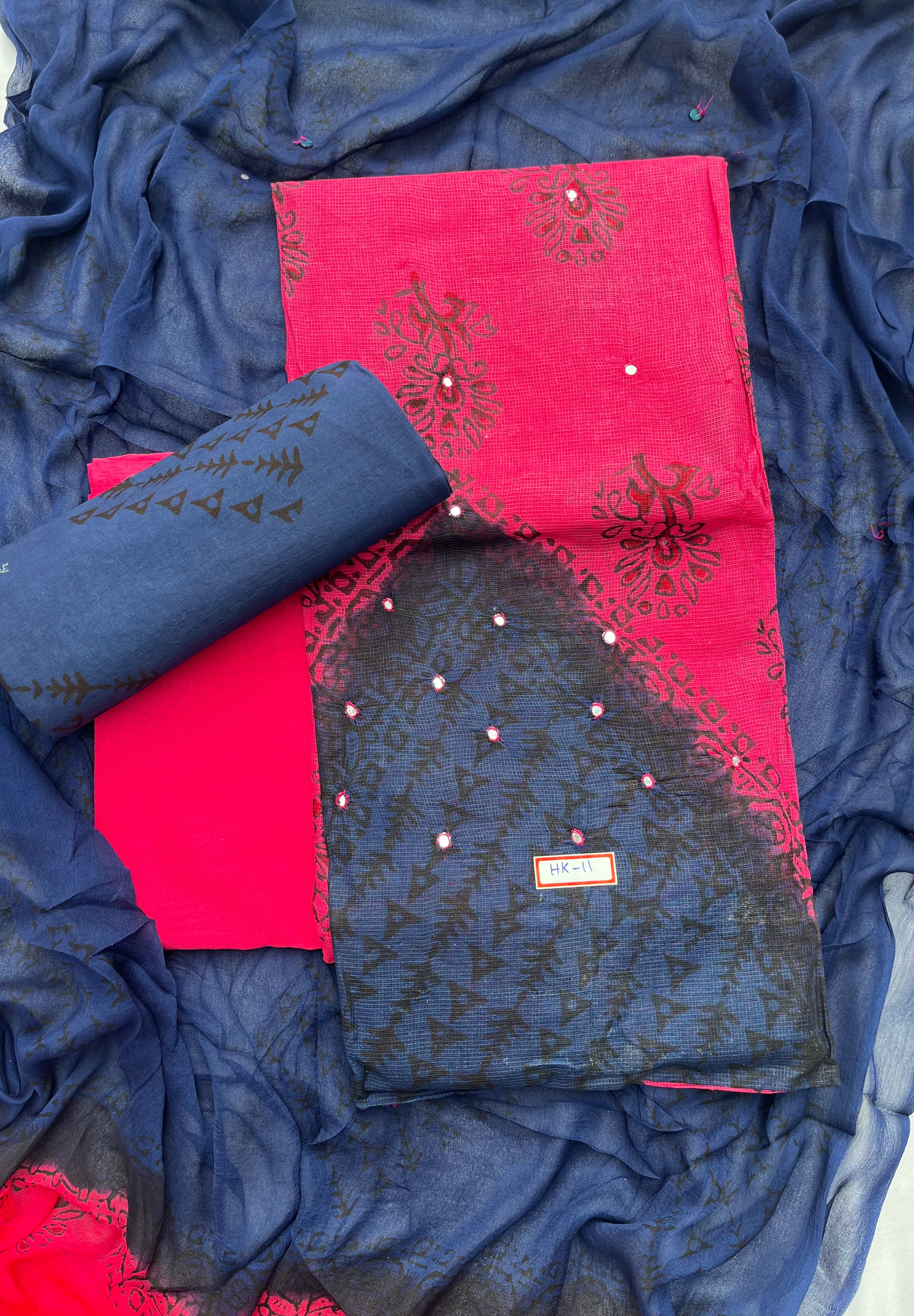 What you will get: 1 Kota Top + 1 Cotton Bottom + 1 Cotton Lining + 1 Georgette Dupatta (All Materials Only).