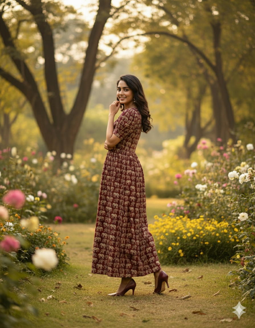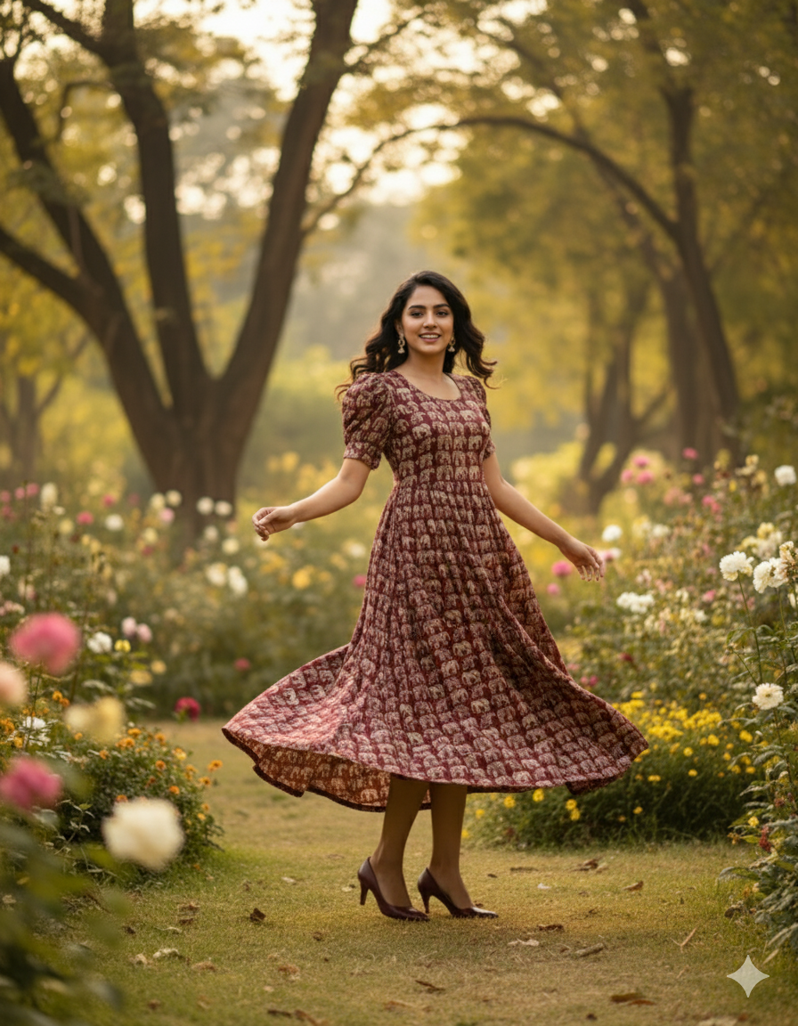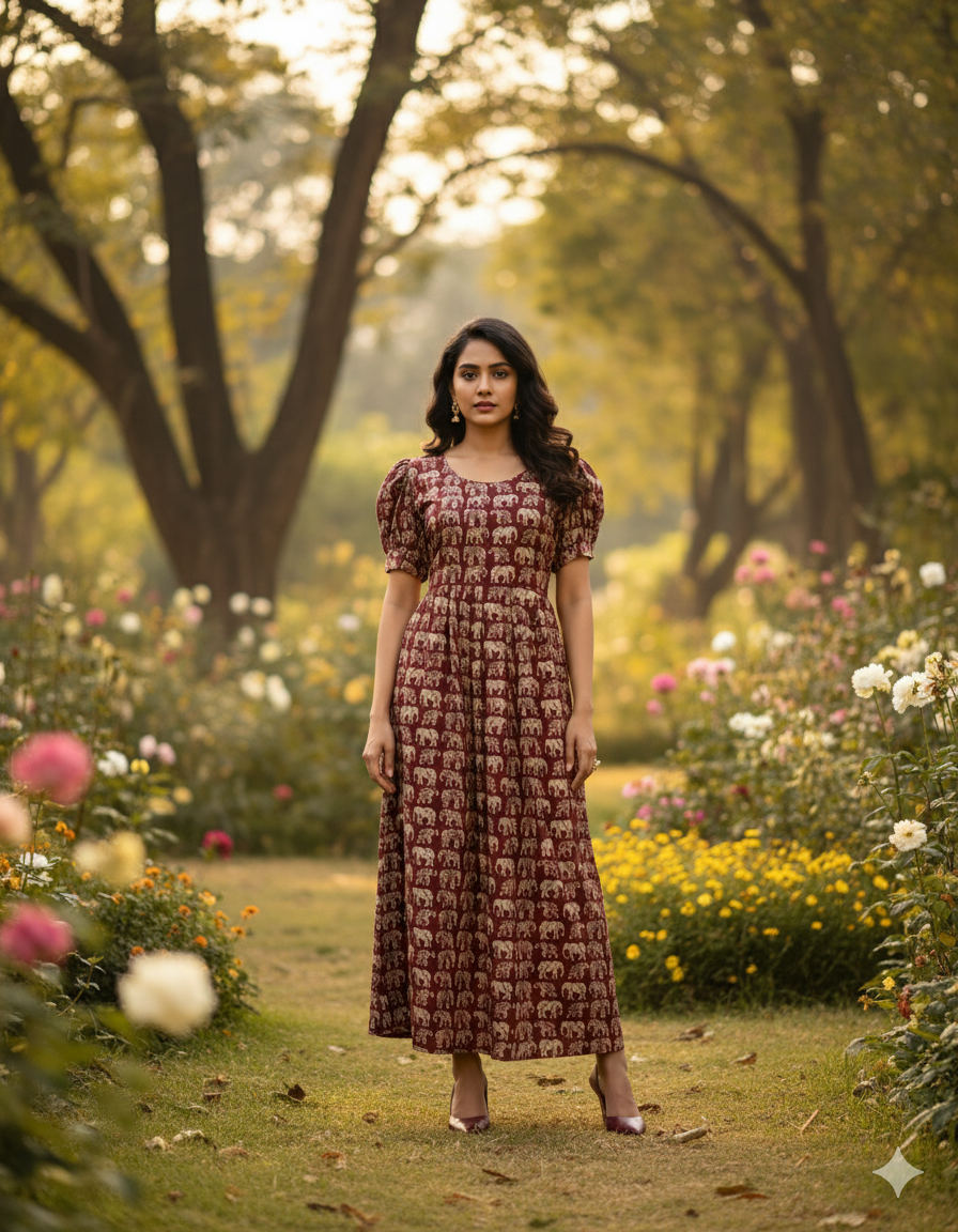 Premium Mul Cotton Frock Maroon – Puff Sleeve Design with Knots, Zero Shrinkage