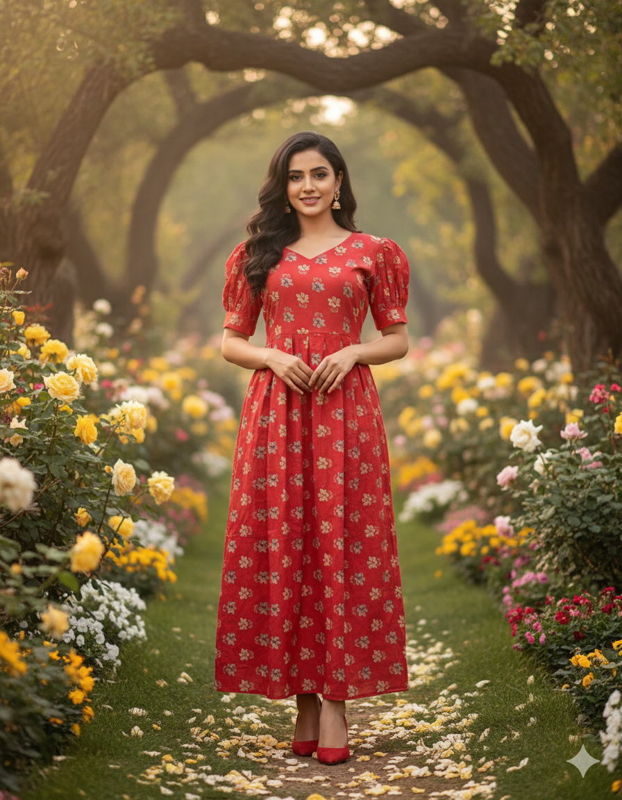 Premium Mul Cotton Frock Red – Puff Sleeve Design with Knots, Zero Shrinkage