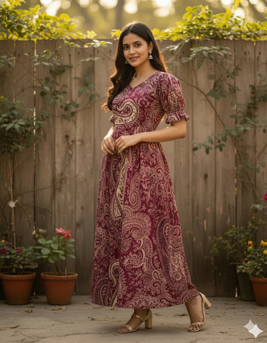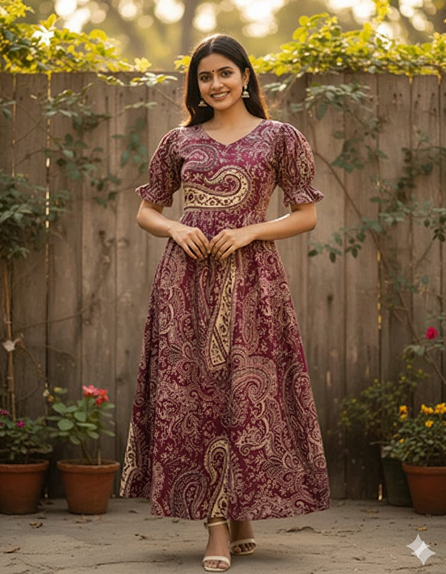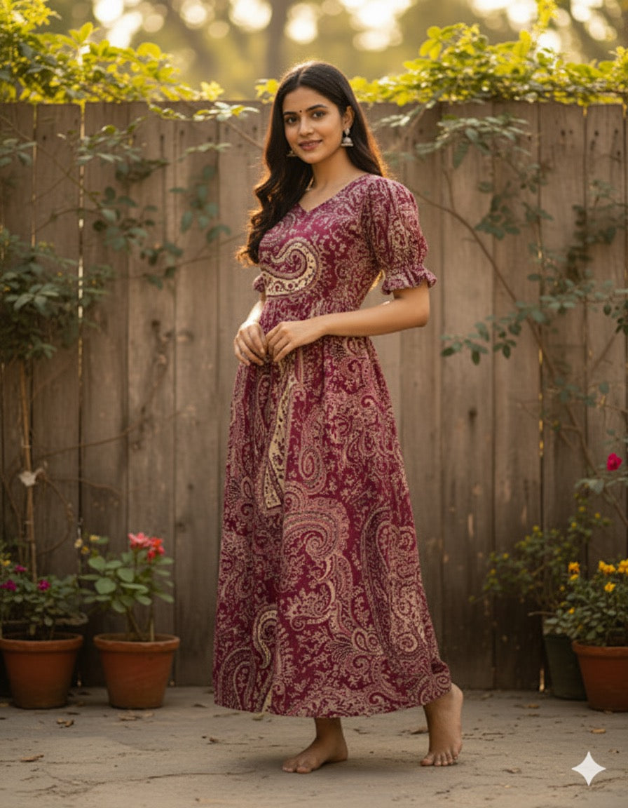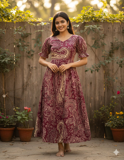 Premium Mul Cotton Frock Wine – Puff Sleeve Design with Knots, Zero Shrinkage