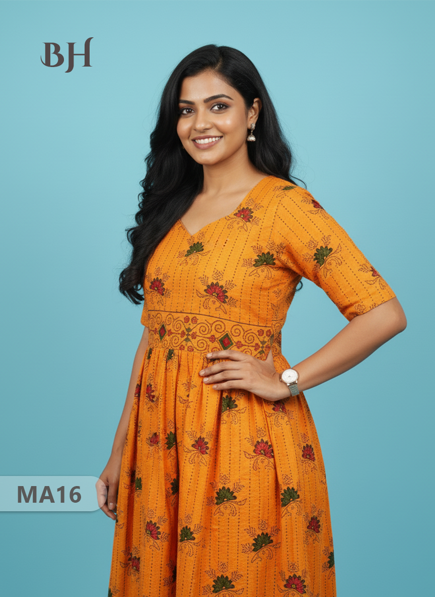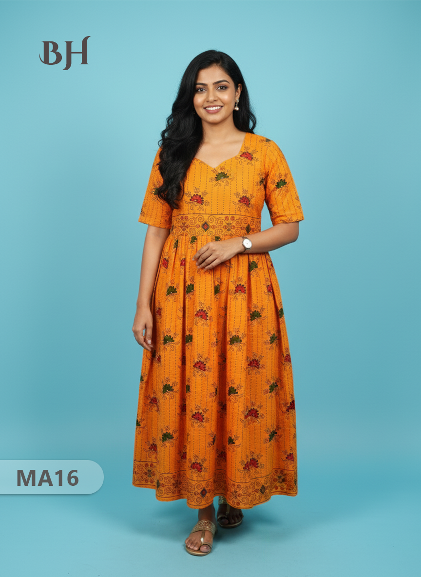 Orange Floral Printed Cotton Frock for Women – Casual Wear | Bhavana Handlooms