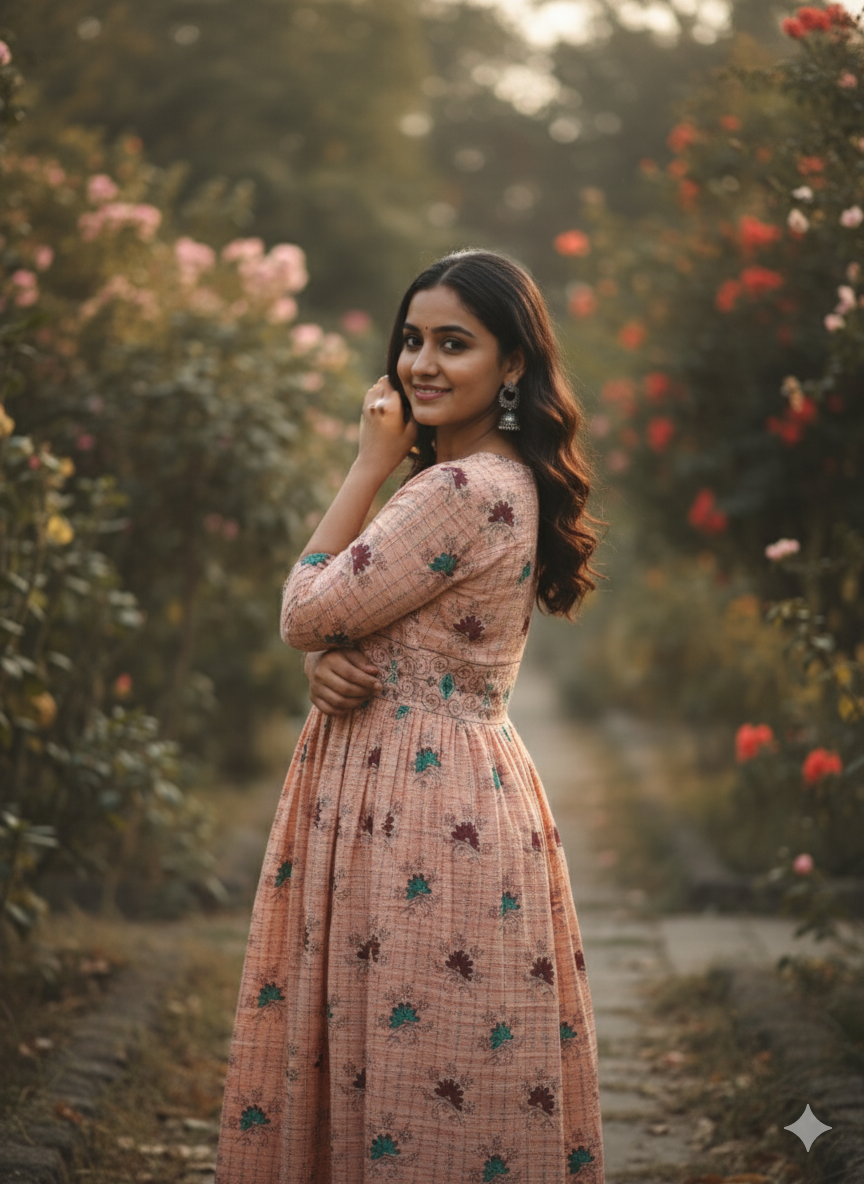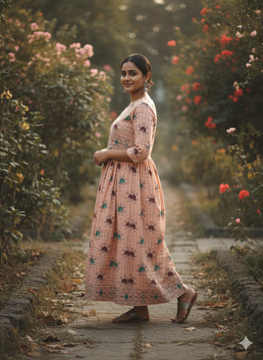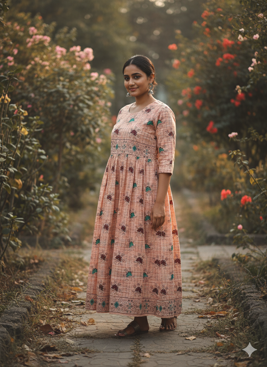 Peach Floral Printed Cotton Frock for Women – Casual Wear | Bhavana Handlooms