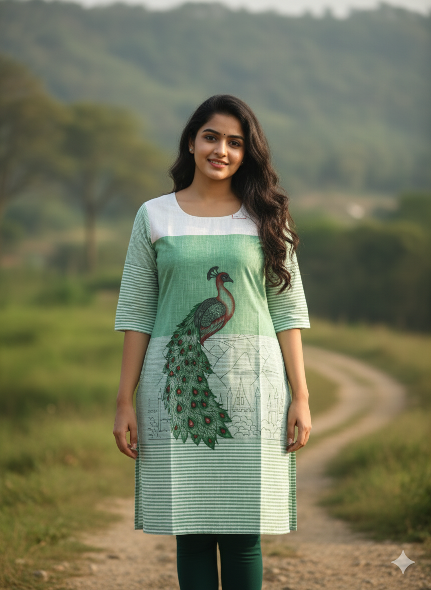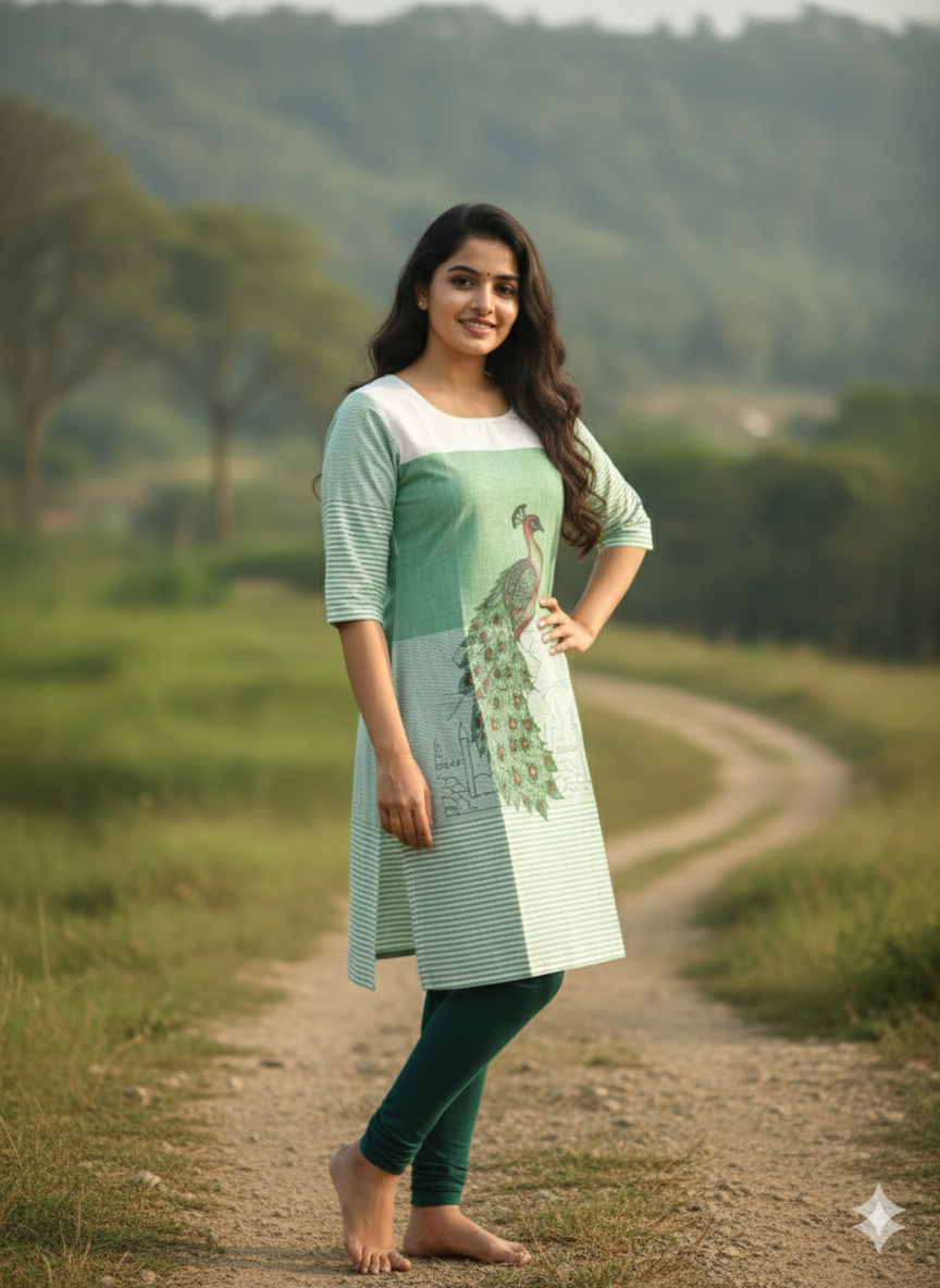 Peacock Design Straight Cut Kurti Sea Green with Full Length Lining