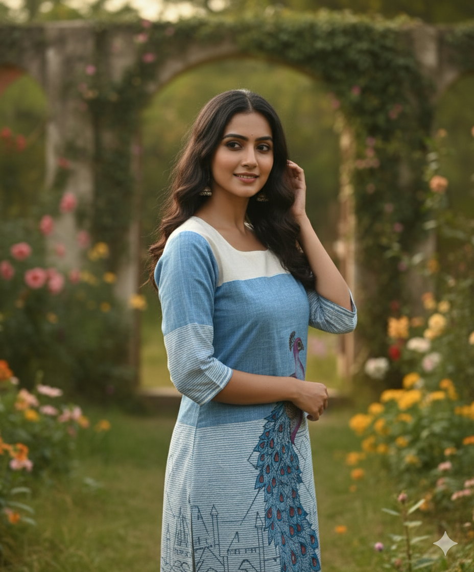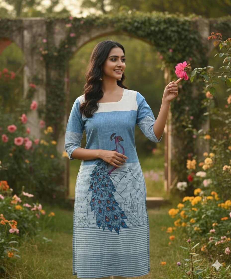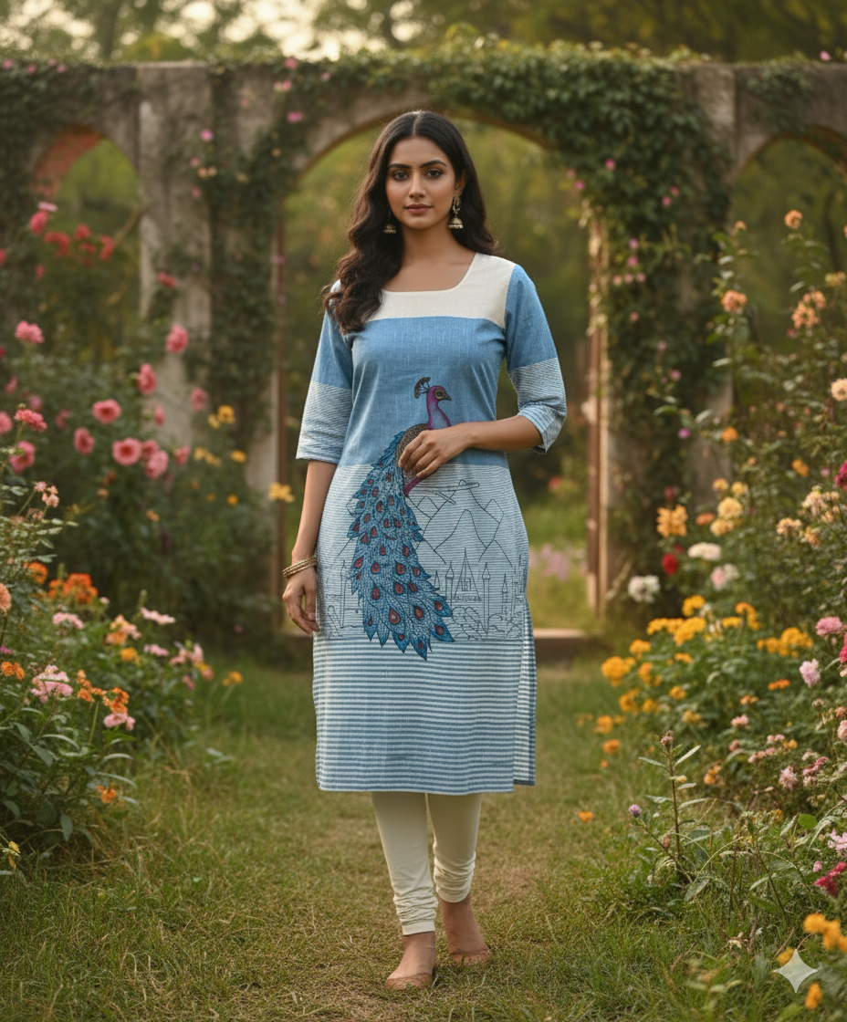 Peacock Design Straight Cut Kurti Sky Blue with Full Length Lining