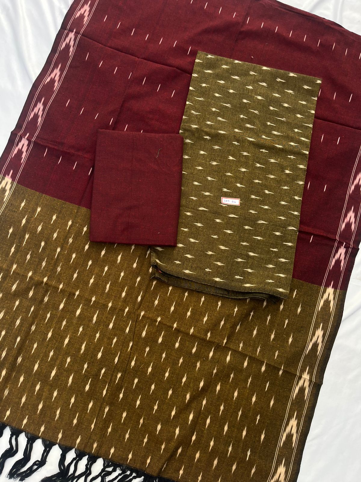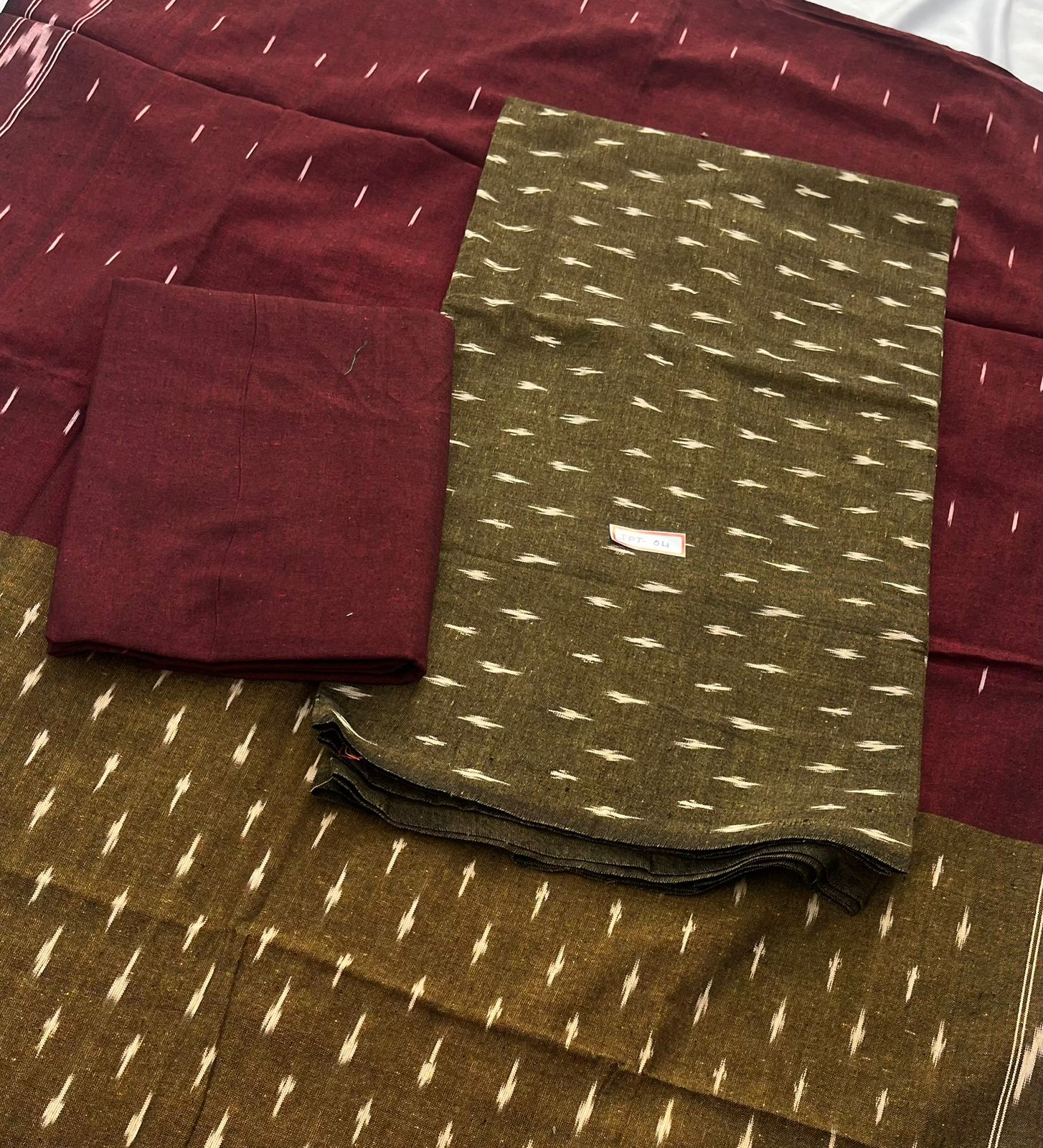 Pochampally ikkath 3pc dress material with Greenish Brown colour