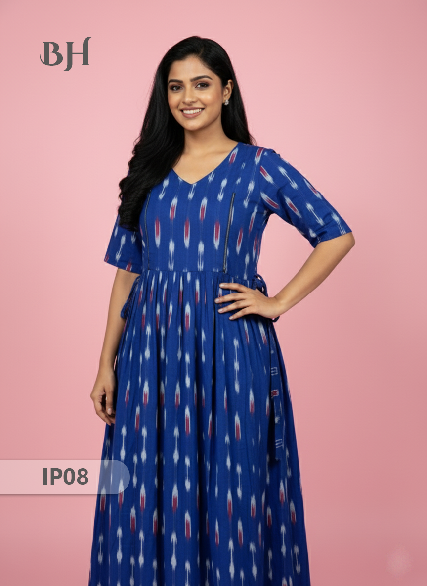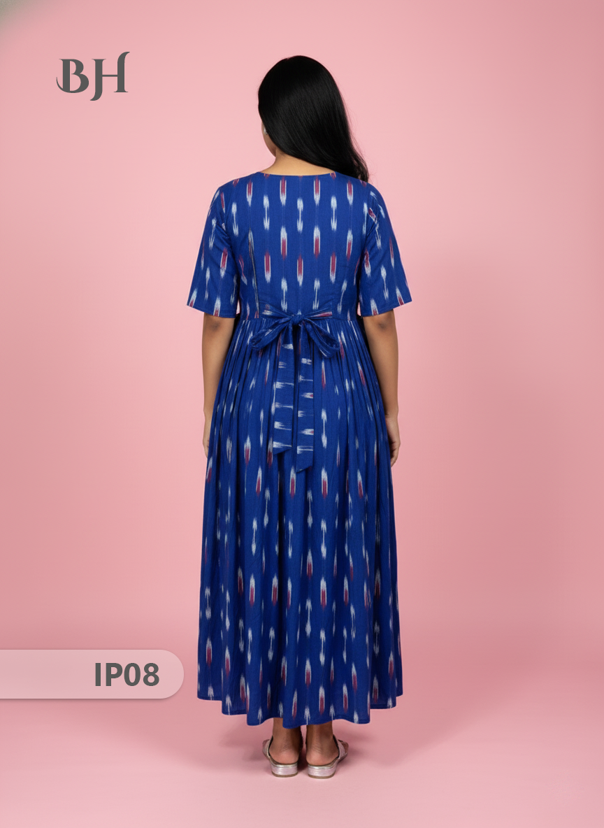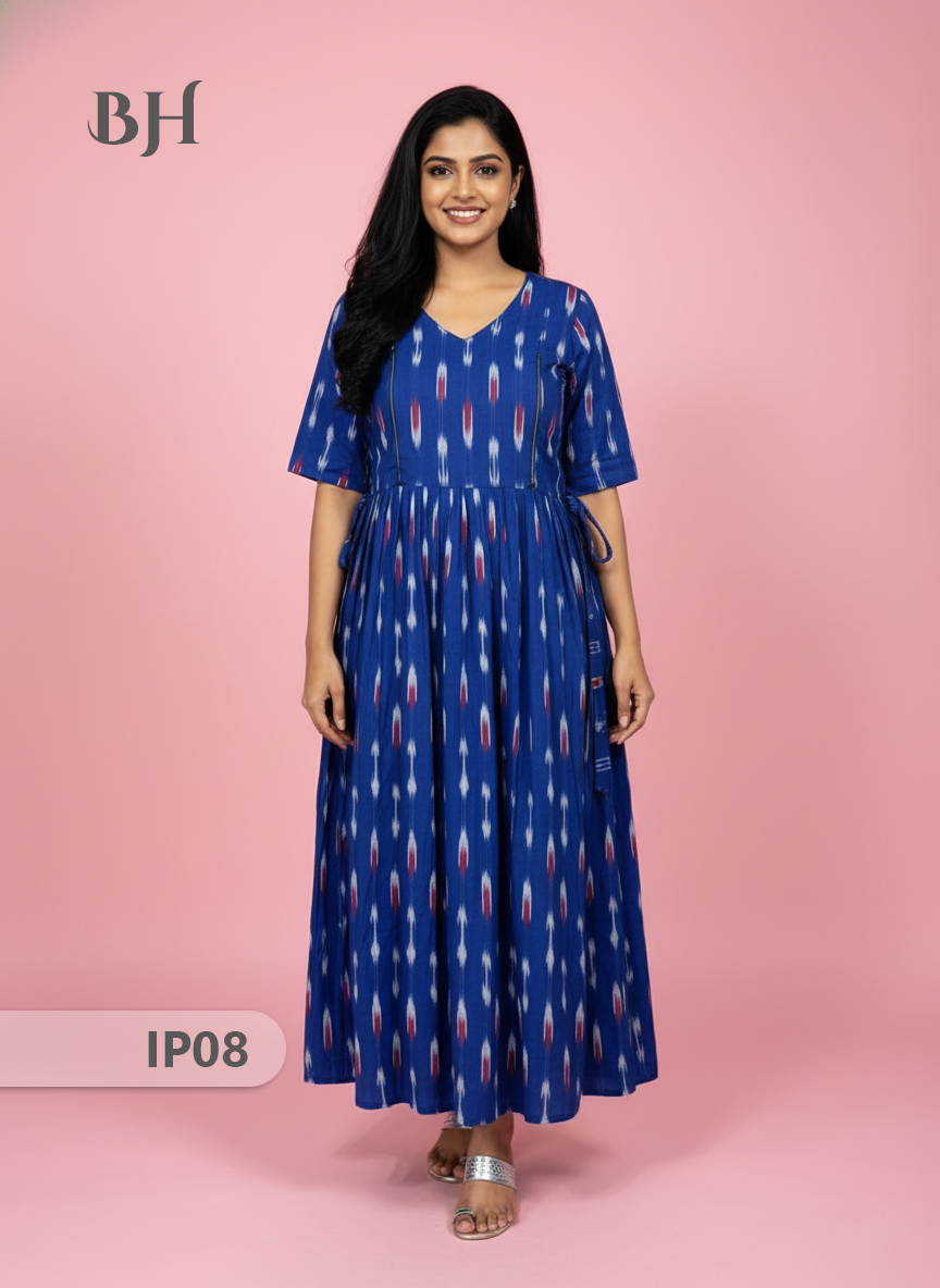 Keywords: Pochampally Ikkath Feeding Frock, Cotton Feeding Dress, Bhavana Originals Exclusive, Handloom Cotton Frock, Nursing Wear for Mothers, Half-Length Lining Feeding Frock.