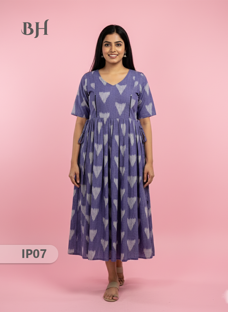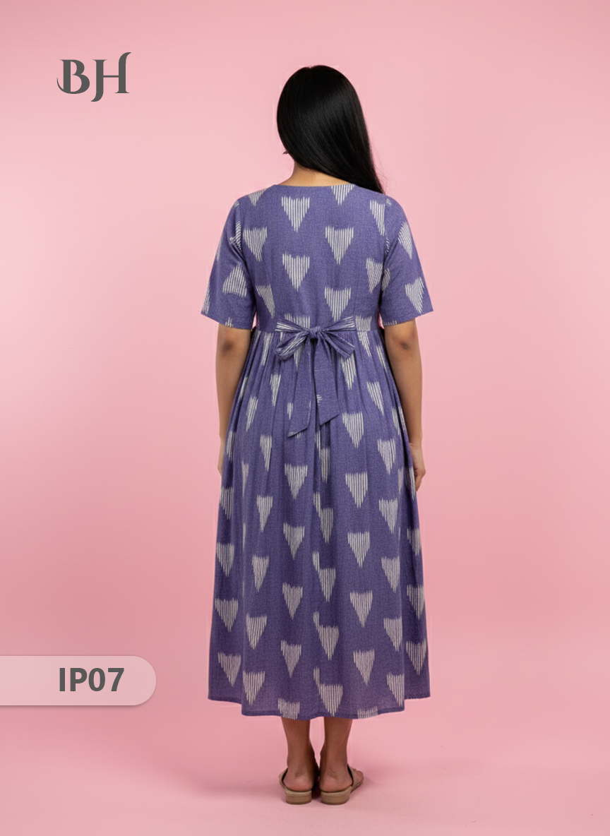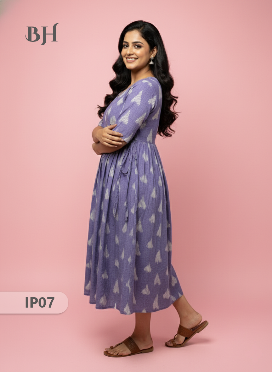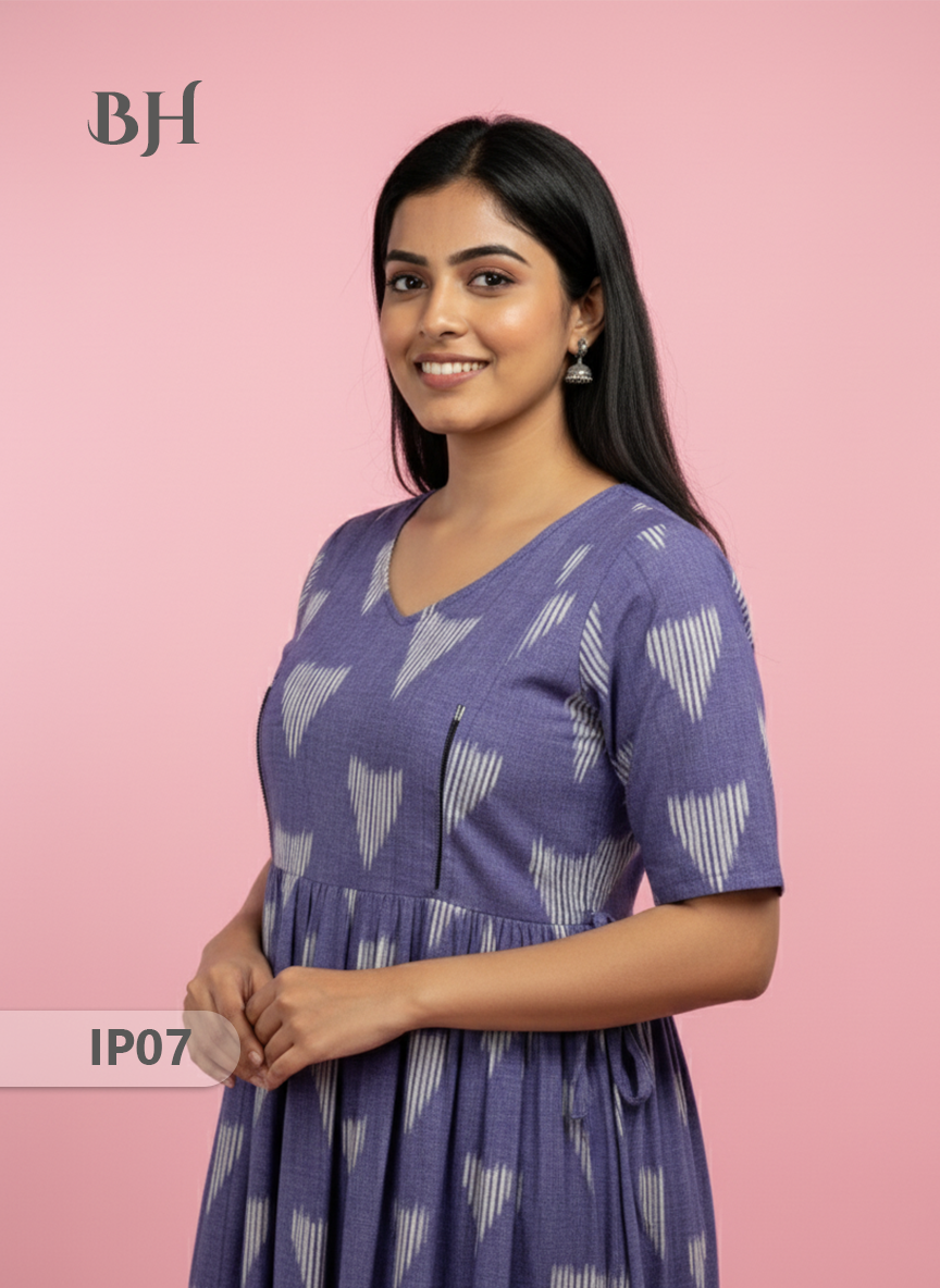 Keywords: Pochampally Ikkath Feeding Frock, Cotton Feeding Dress, Bhavana Originals Exclusive, Handloom Cotton Frock, Nursing Wear for Mothers, Half-Length Lining Feeding Frock.