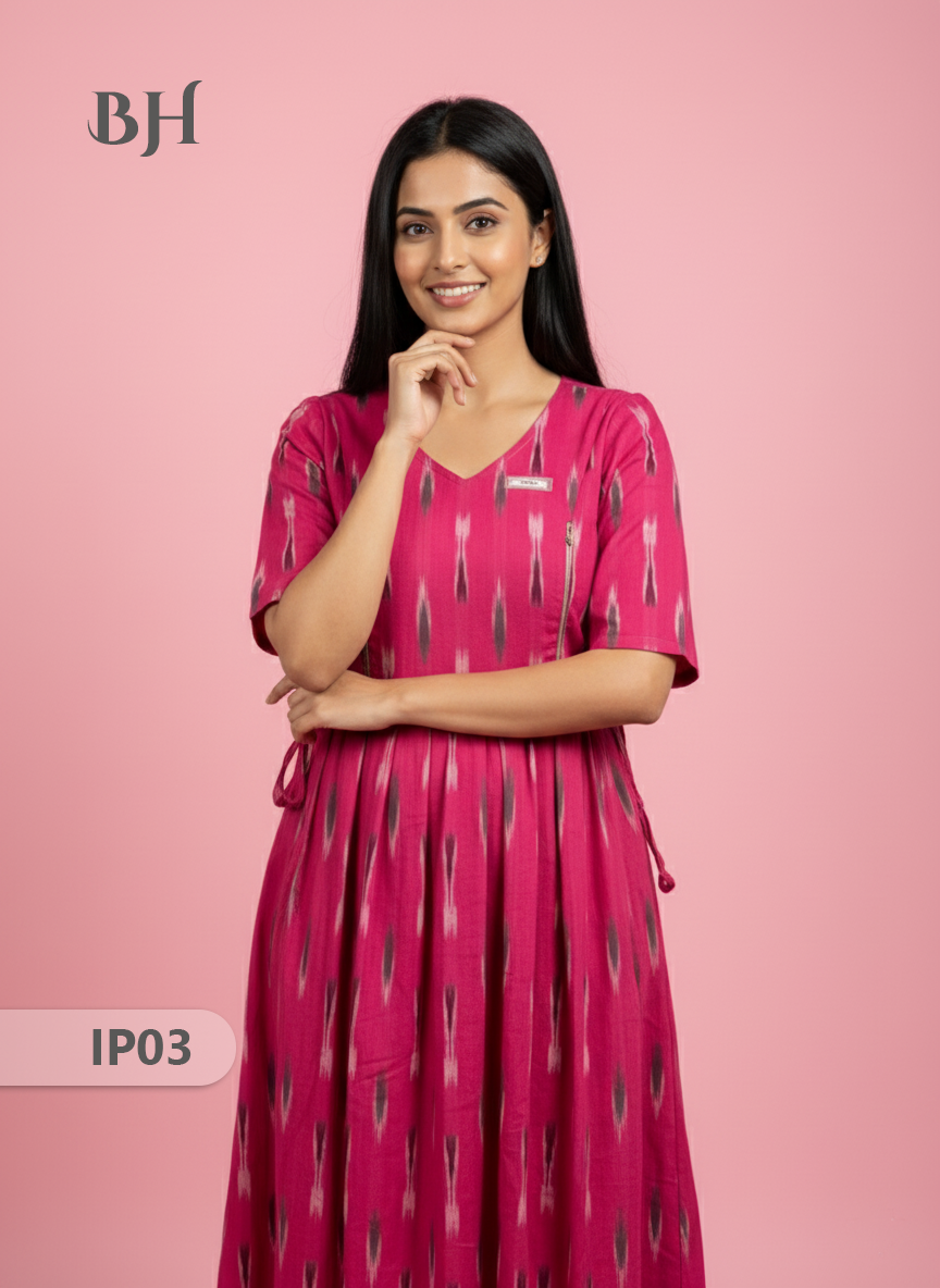 Keywords: Pochampally Ikkath Feeding Frock, Cotton Feeding Dress, Bhavana Originals Exclusive, Handloom Cotton Frock, Nursing Wear for Mothers, Half-Length Lining Feeding Frock.