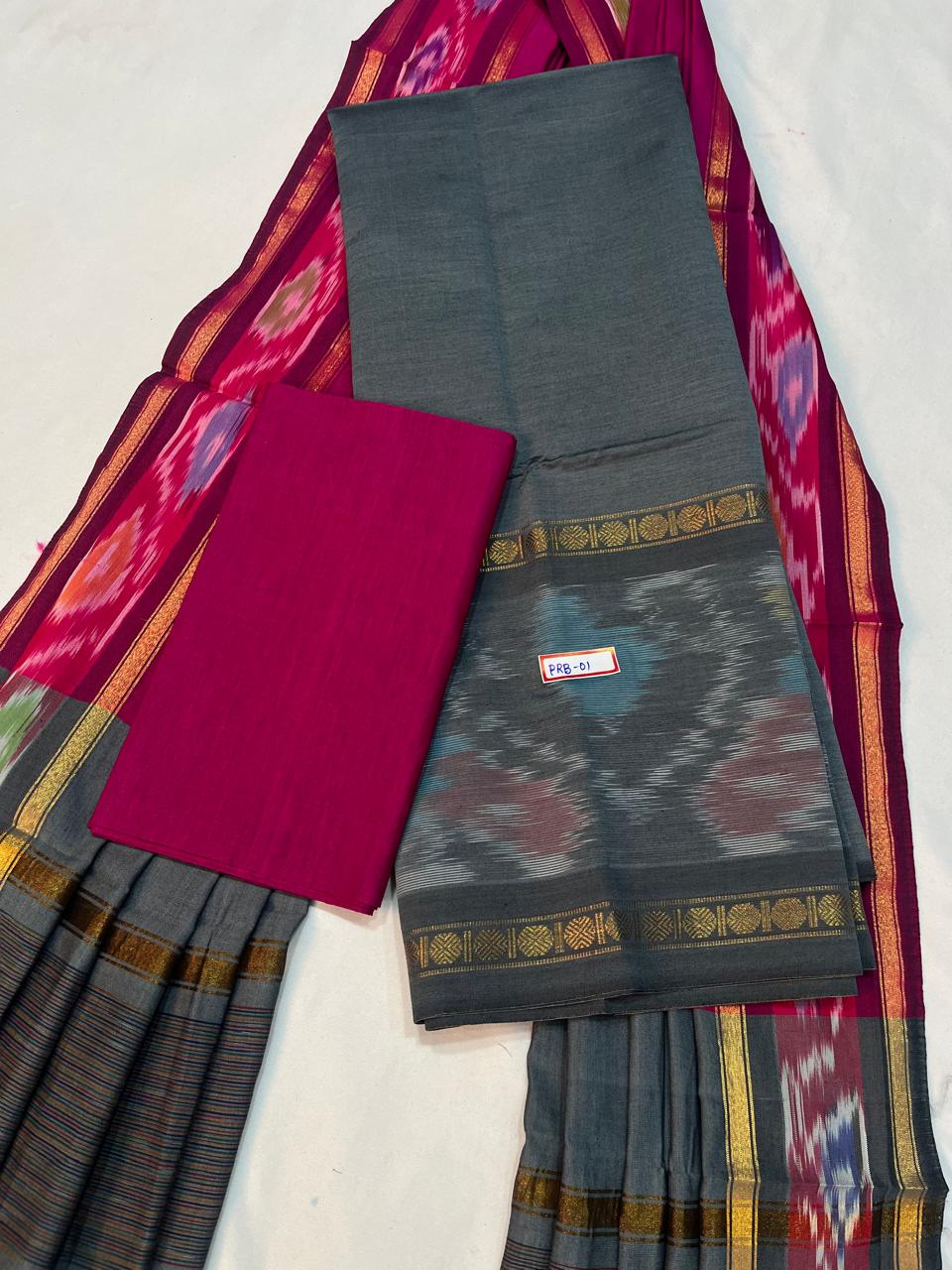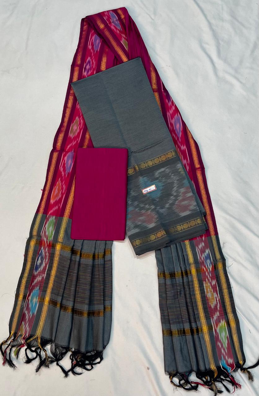 Pochampally Rudraksha Border Dress Material – Gray Mercerised Fabric | Traditional Handloom Cotton Set