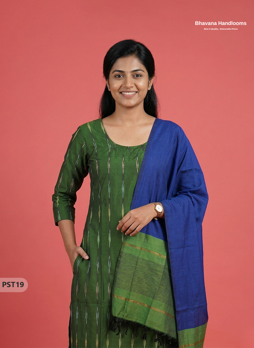 Pochampally Semi Pattu 3PC Kurti Set in Dark Green Colour | Ready-to-Wear Ethnic Wear