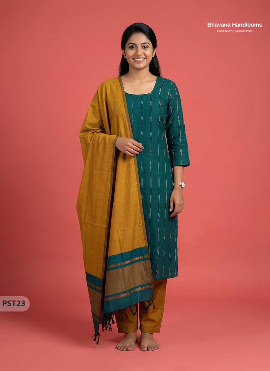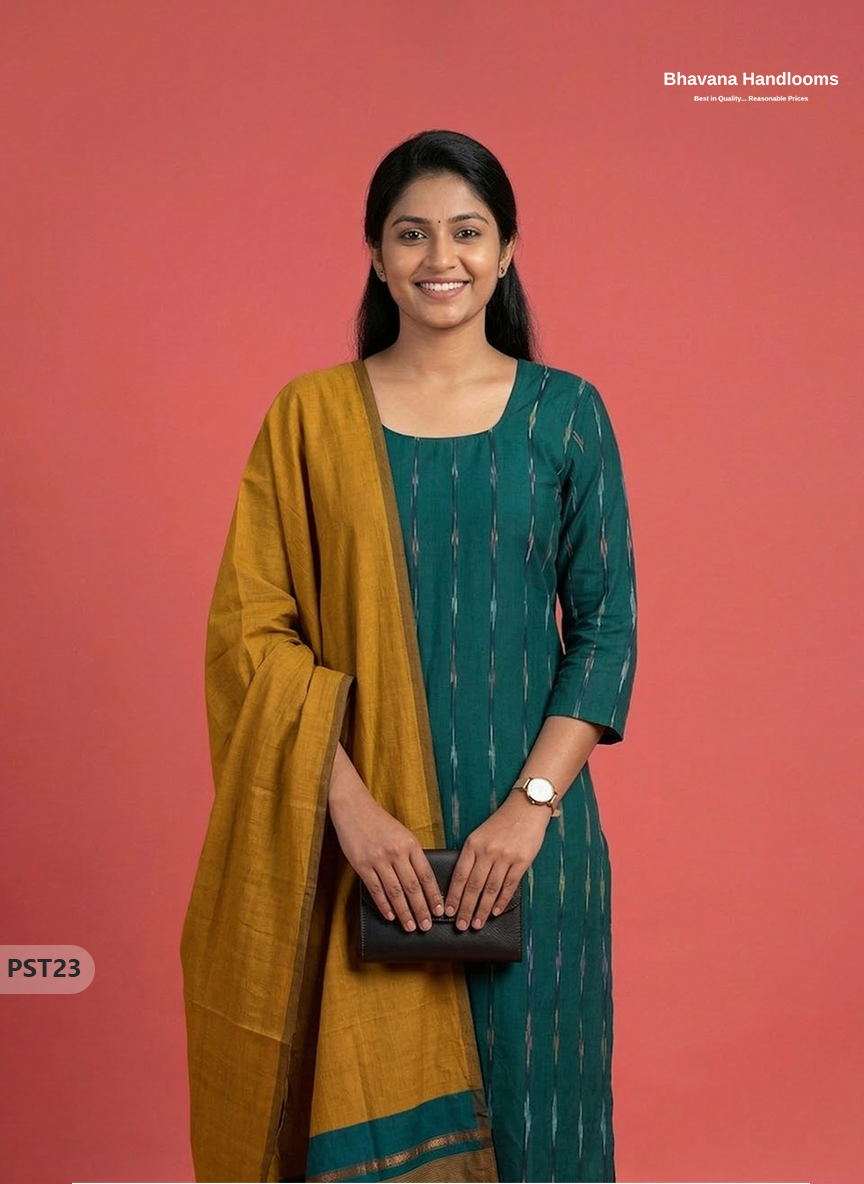 Pochampally Semi Pattu 3PC Kurti Set in Drak Green Colour | Ready-to-Wear Ethnic Wear