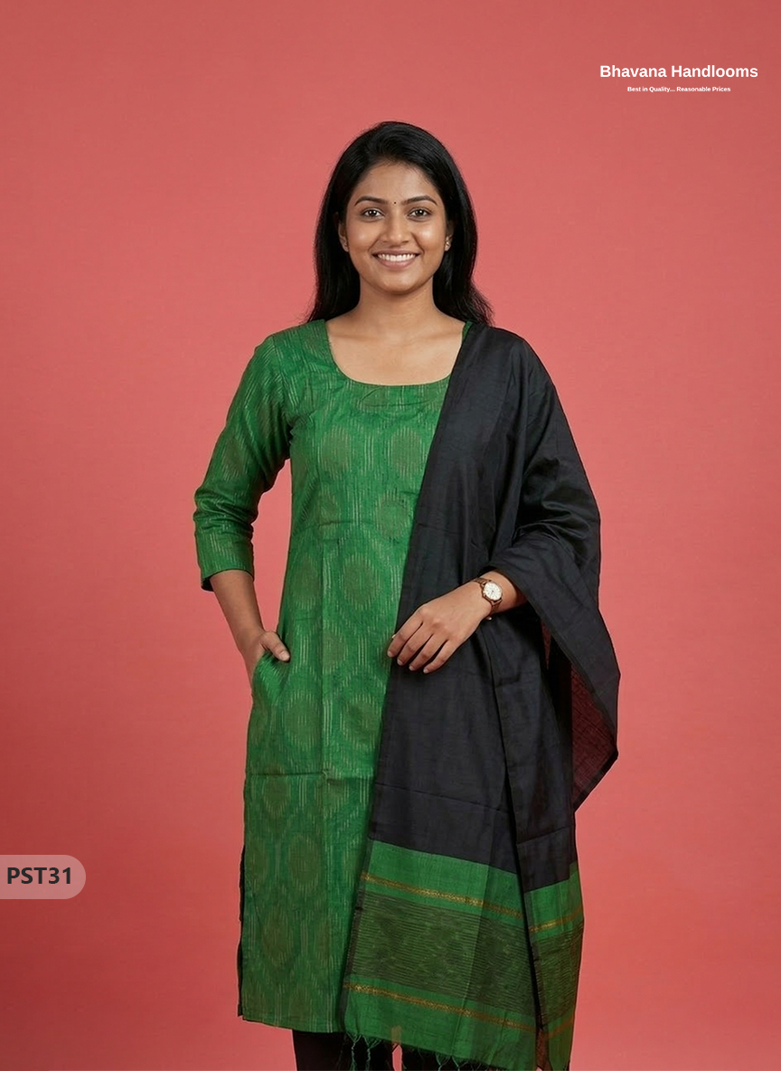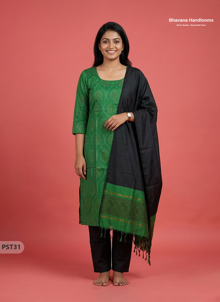 Pochampally Semi Pattu 3PC Kurti Set in Green Colour | Ready-to-Wear Ethnic Wear