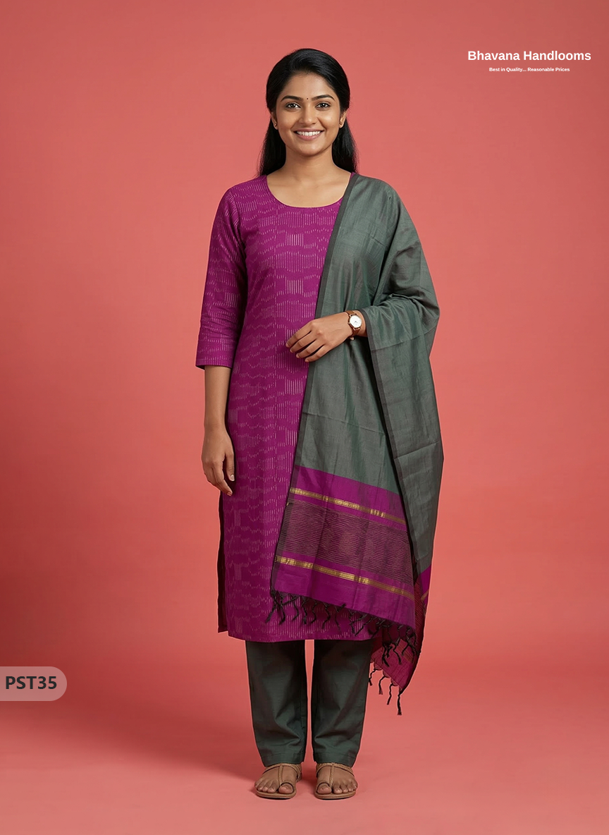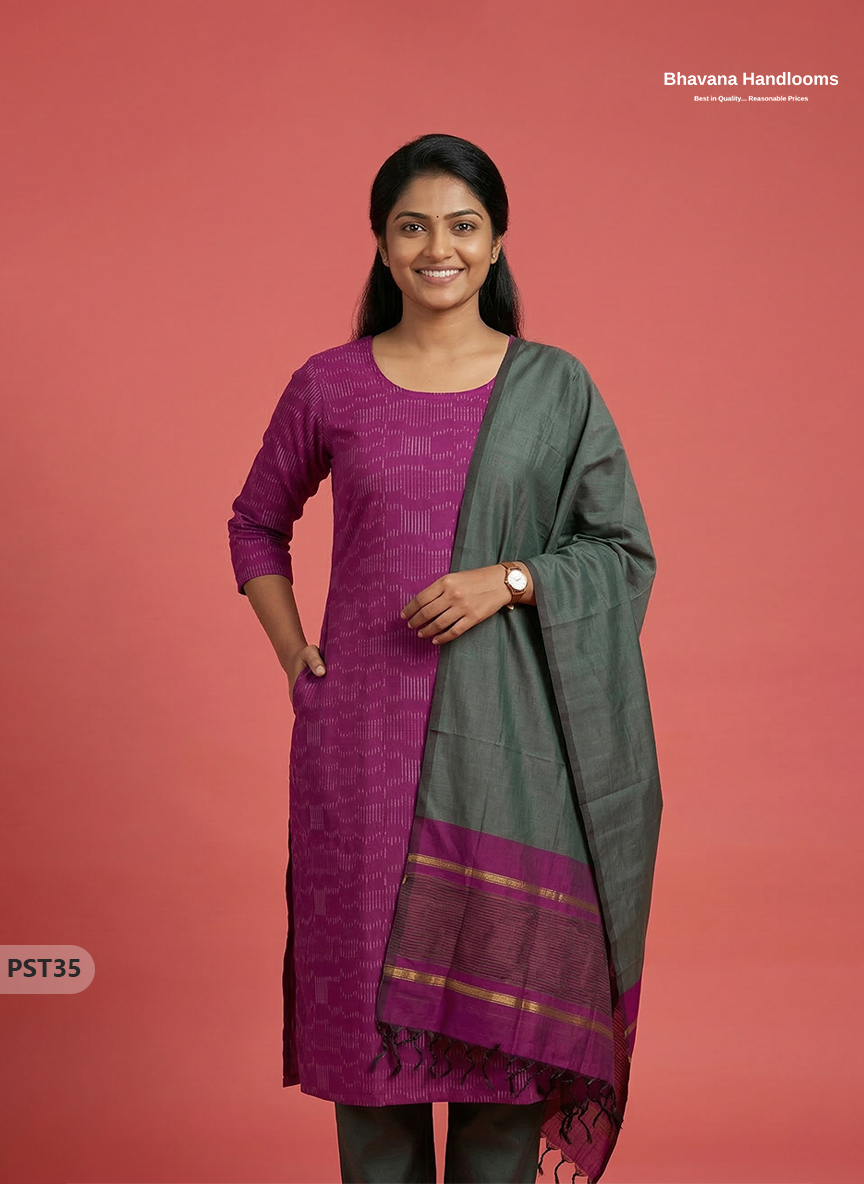 Pochampally Semi Pattu 3PC Kurti Set in Pink Colour | Ready-to-Wear Ethnic Wear