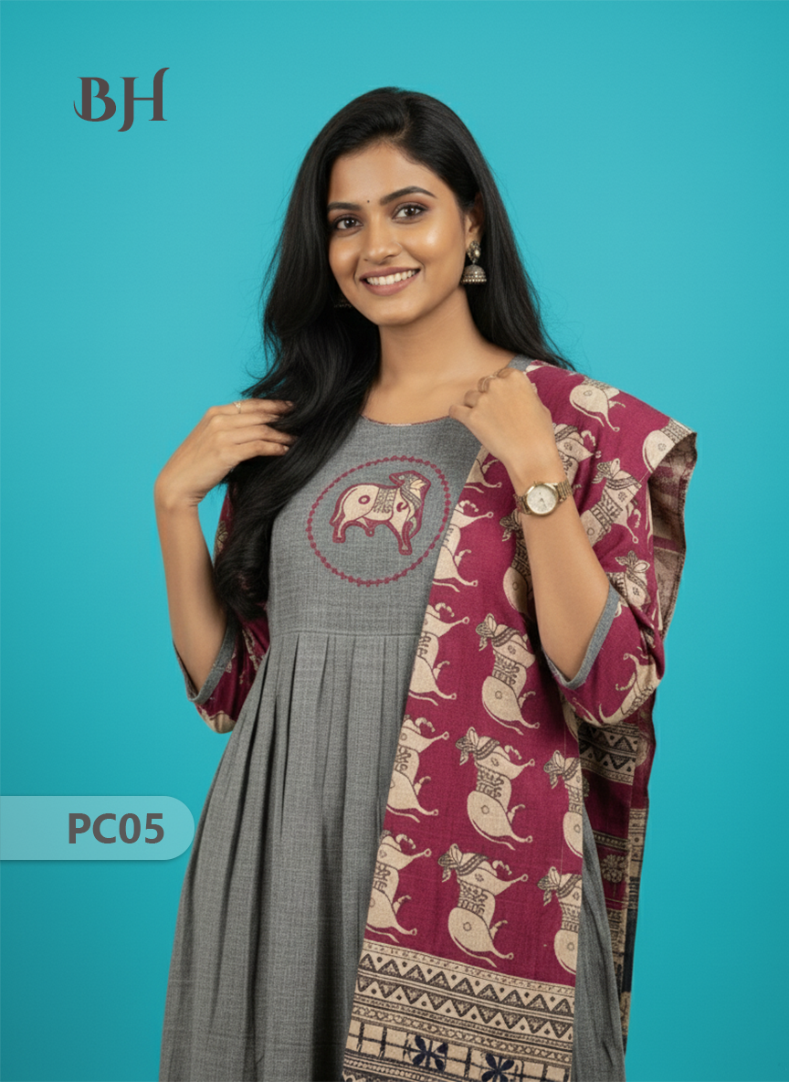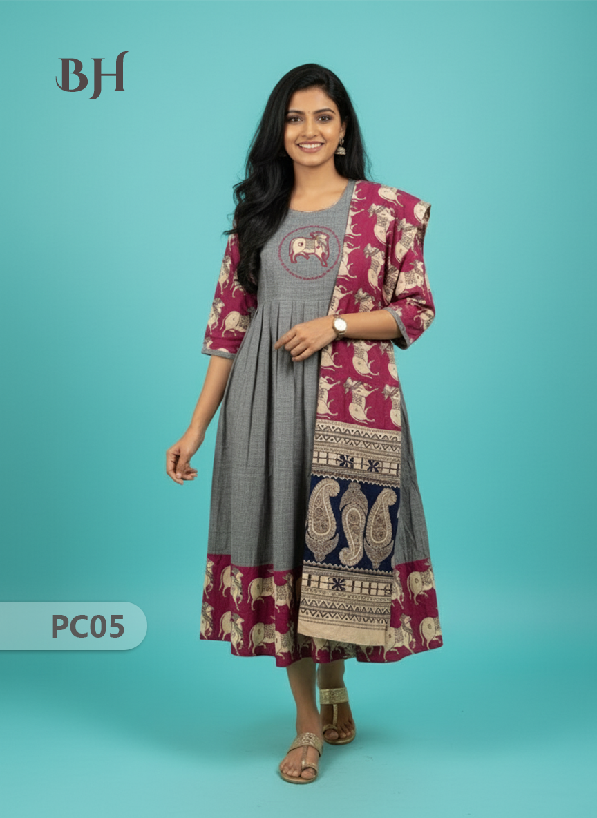 Keywords: Premium 2-Piece Frock Set, Bhavana Originals Exclusive, Cotton Frock with Dupatta, Women’s Ethnic Wear, Yoke Part Lined Kurti Dress Set.