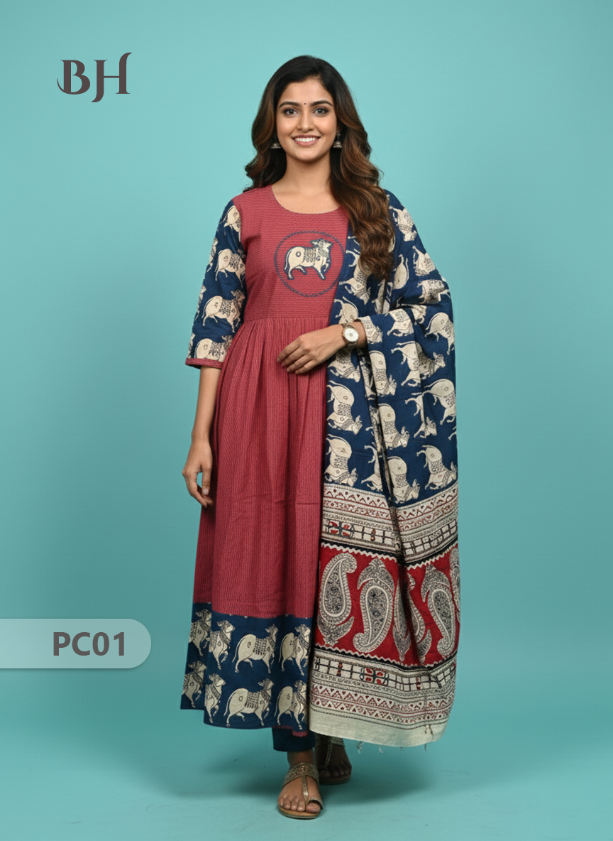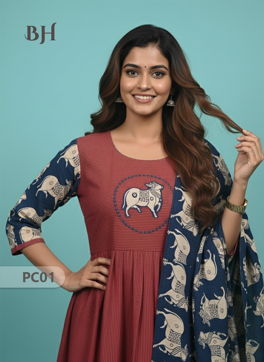 Keywords: Premium 2-Piece Frock Set, Bhavana Originals Exclusive, Cotton Frock with Dupatta, Women’s Ethnic Wear, Yoke Part Lined Kurti Dress Set.