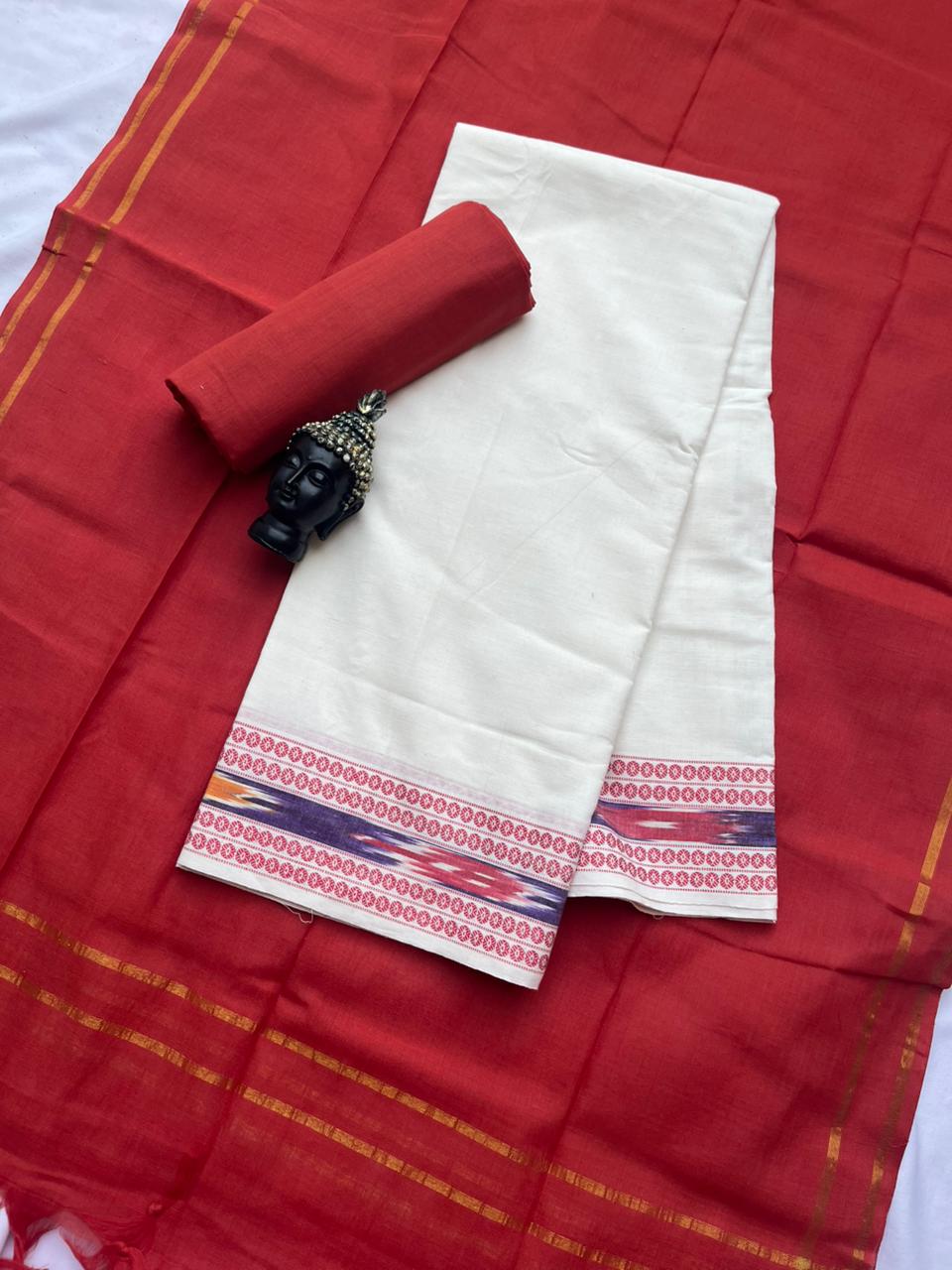 Premium Cotton 3Pc Dress Material with Pochampally Border | White colour