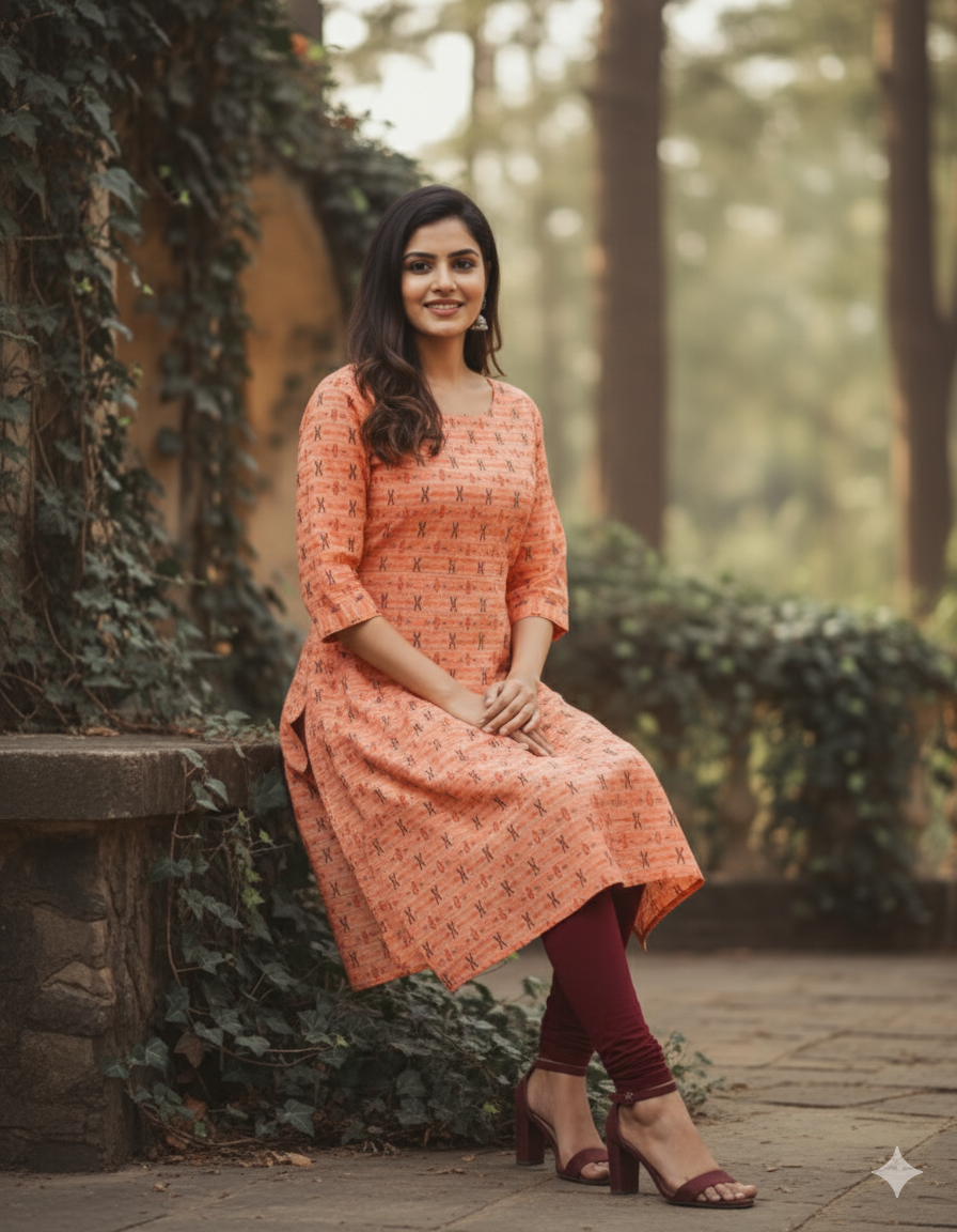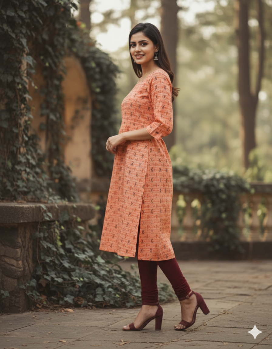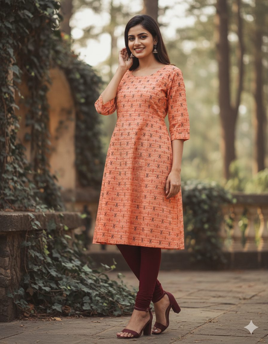 Premium Cotton Straight Cut Kurti – Orange Floral Print Design for Women