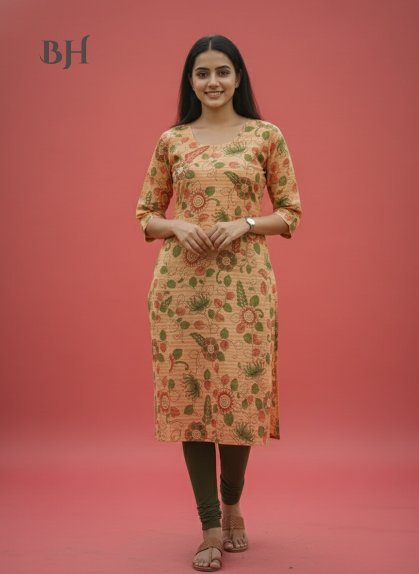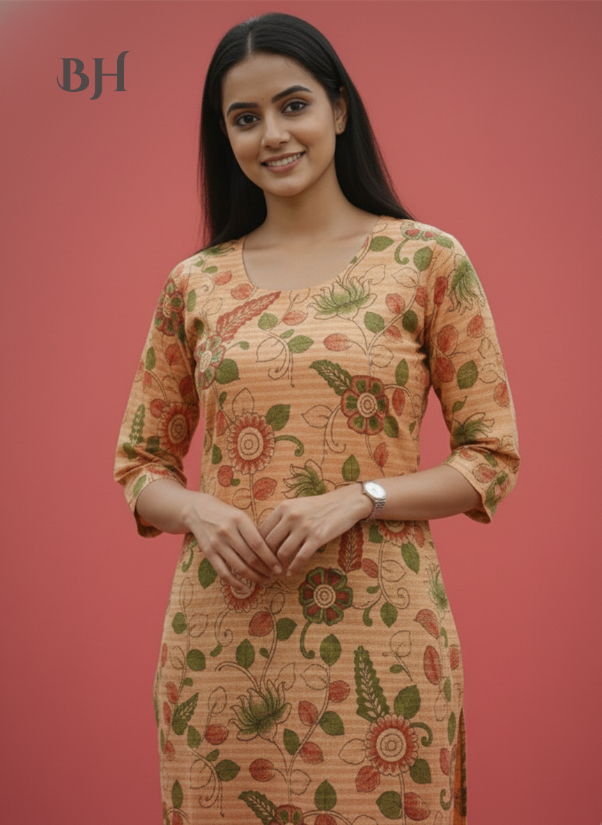 Premium Cotton Straight Cut Kurti Orange – Elegant Floral Print for Women
