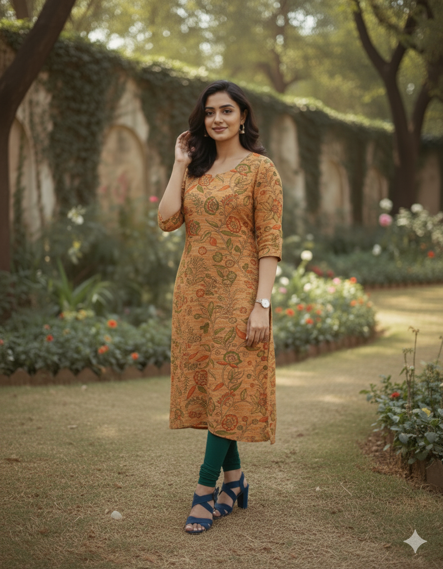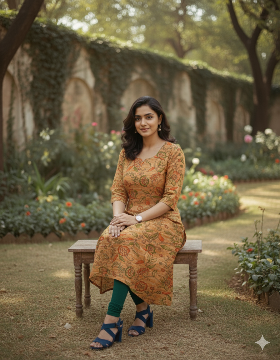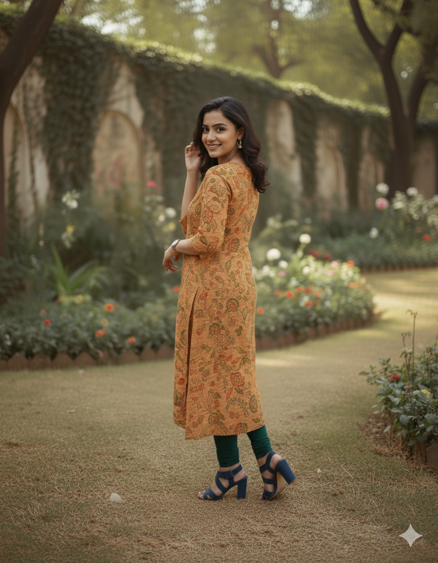 Premium Cotton Straight Cut Kurti – Fiery Orange Floral Print Design