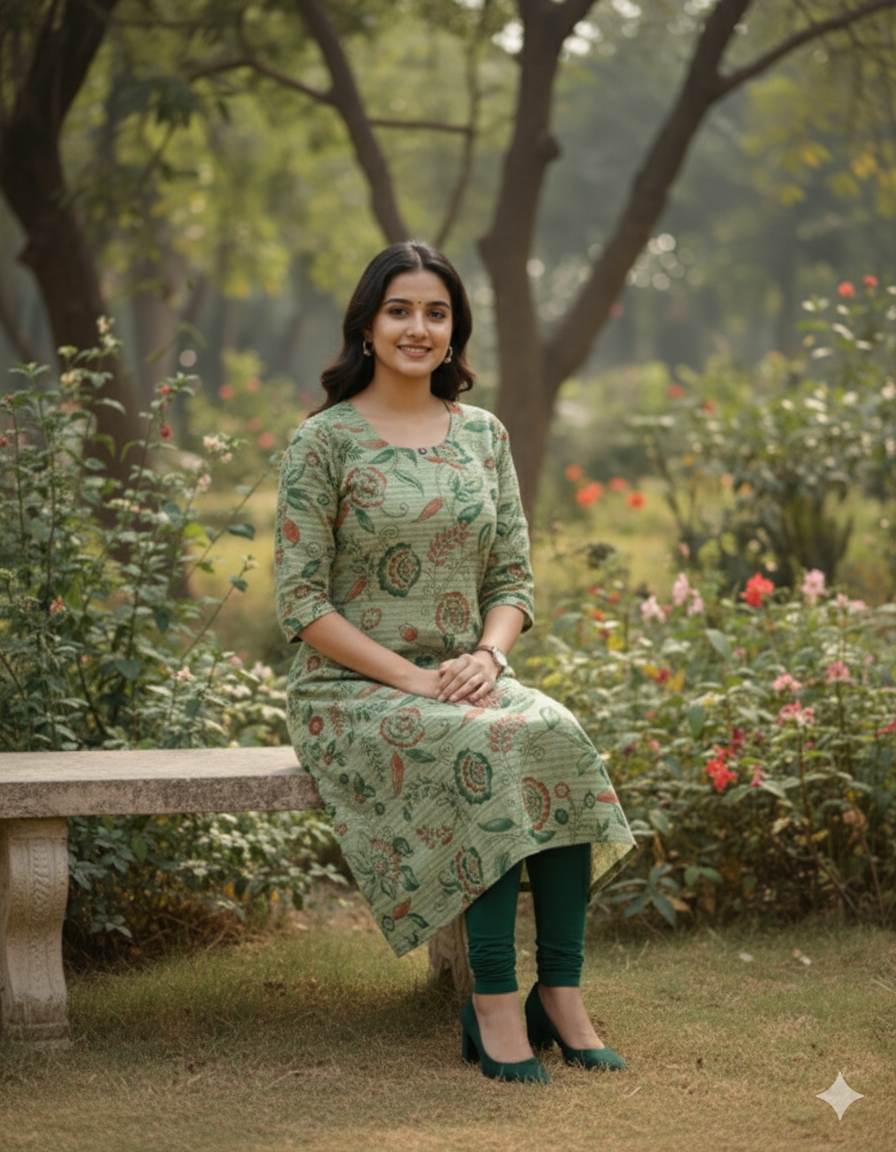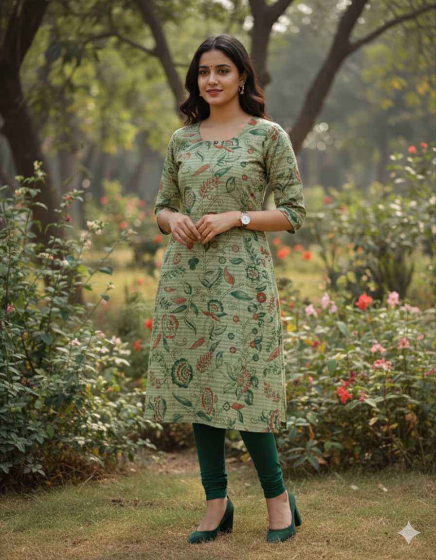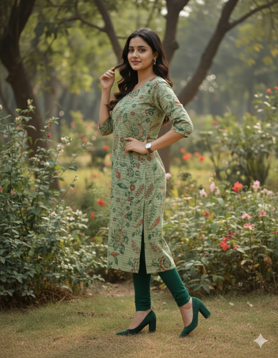 Premium Straight Cut Kurti – Pale Green Colour with Beautiful Floral Print