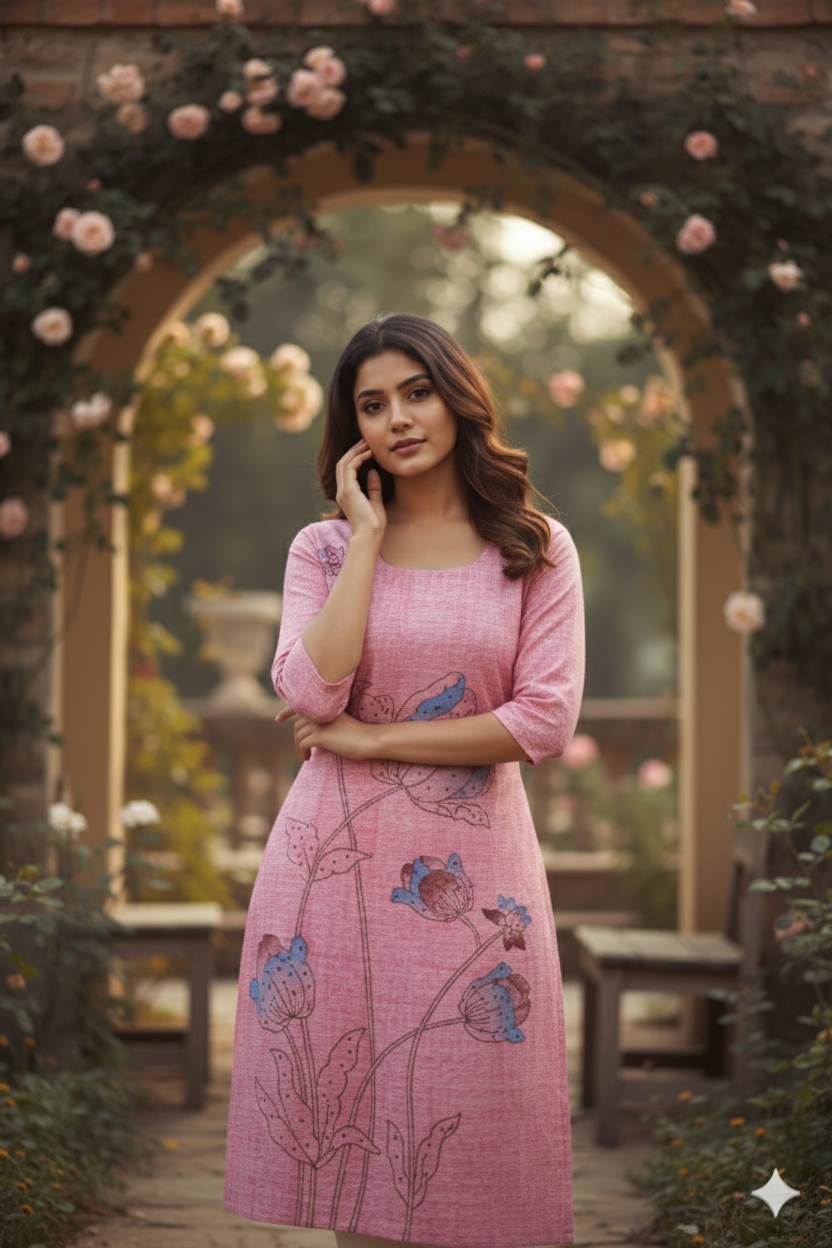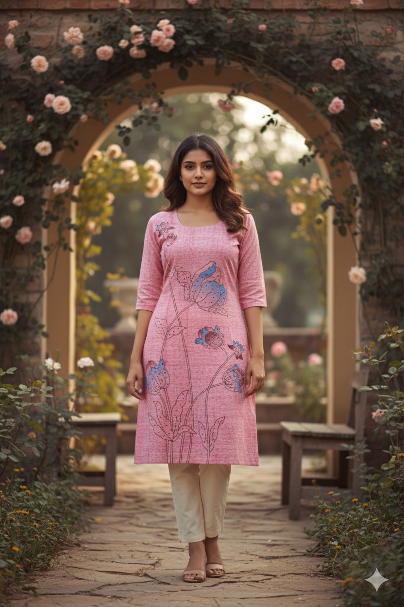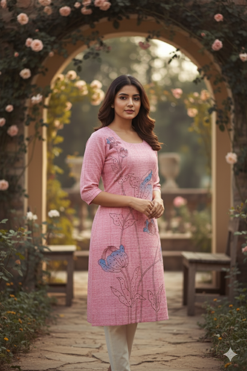 Premium Straight Cut Kurti – Pink Colour with Beautiful Floral Print