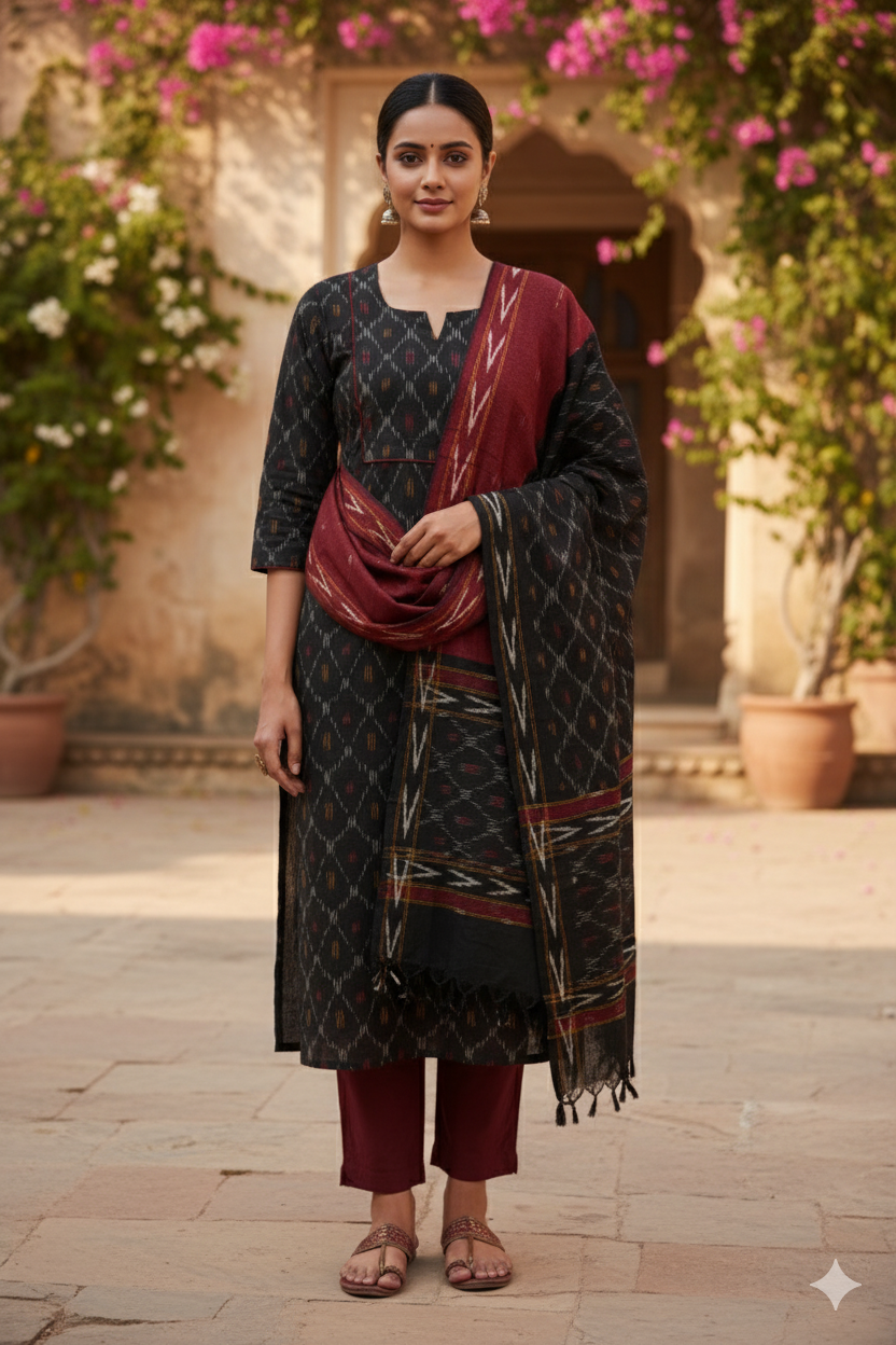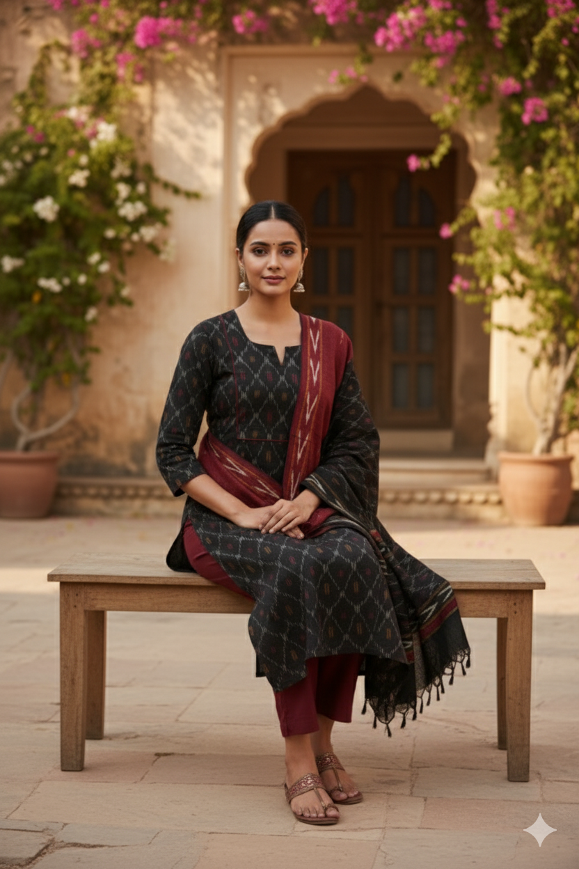 Premium Ikkat 3 Piece Stitched Set – Ready to Wear Kurta, Bottom & Dupatta – Black Colour Handloom Ethnic Wear