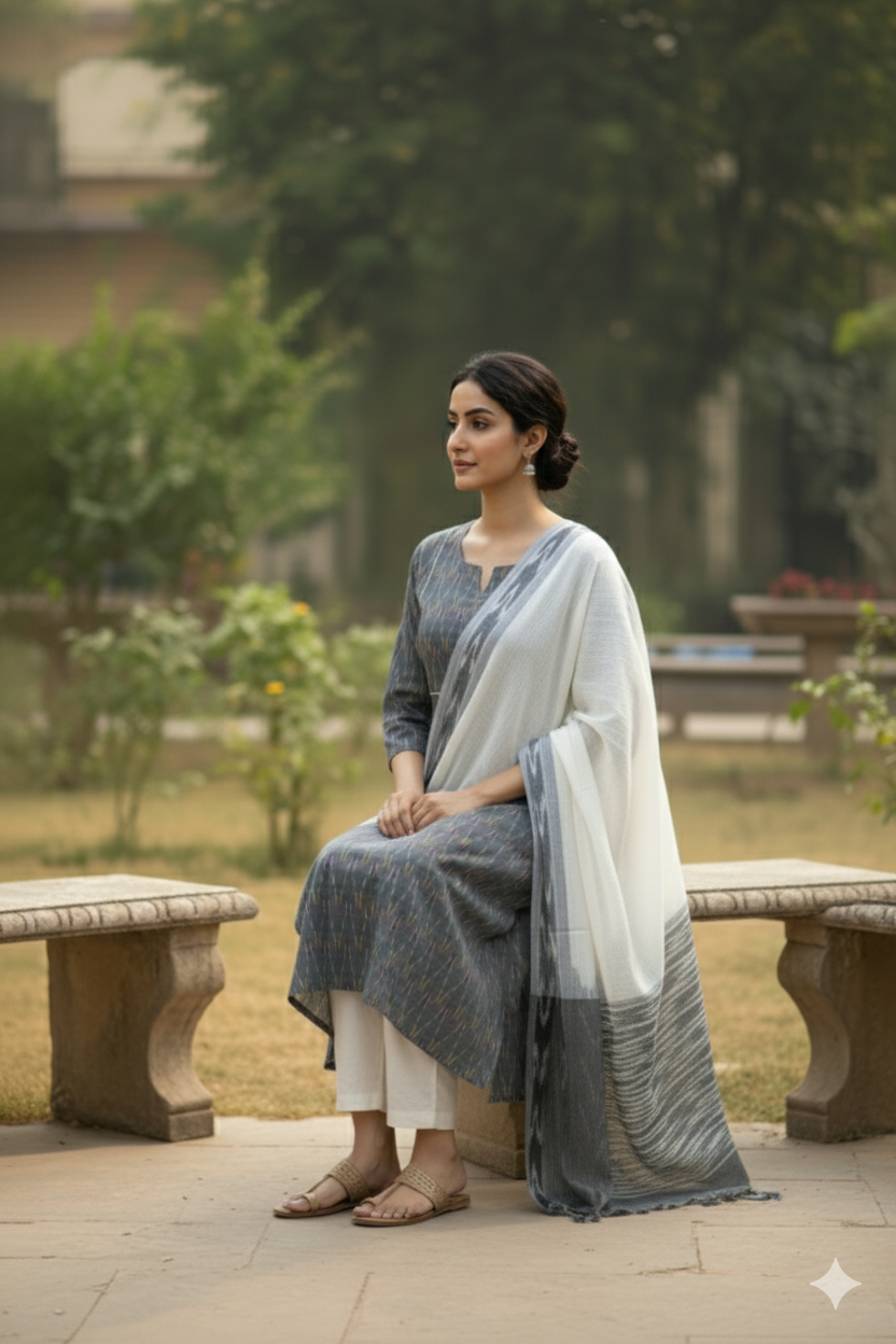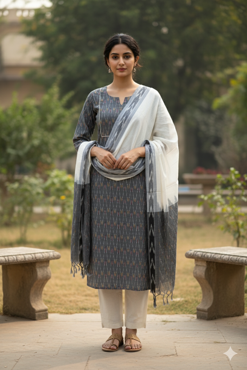 Premium Ikkat 3 Piece Stitched Set – Ready to Wear Kurta, Bottom & Dupatta – Gray colour Handloom Ethnic Wear