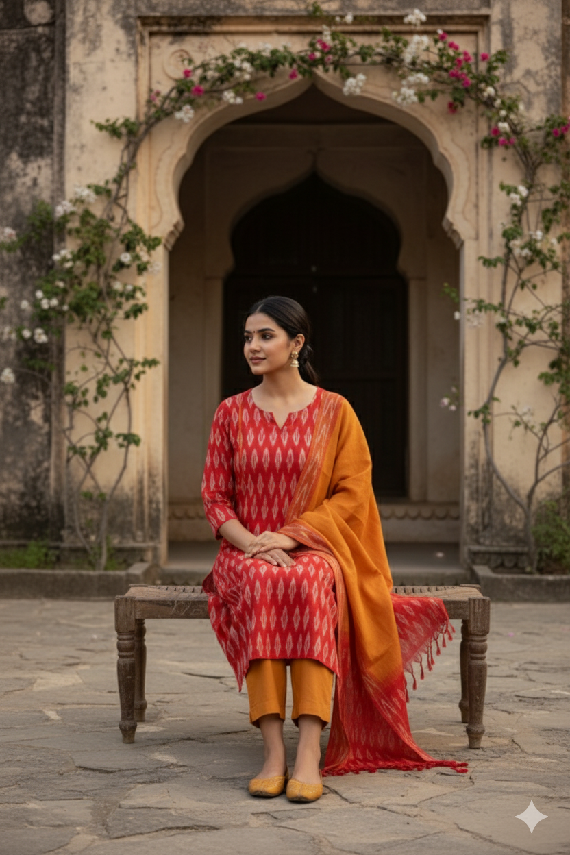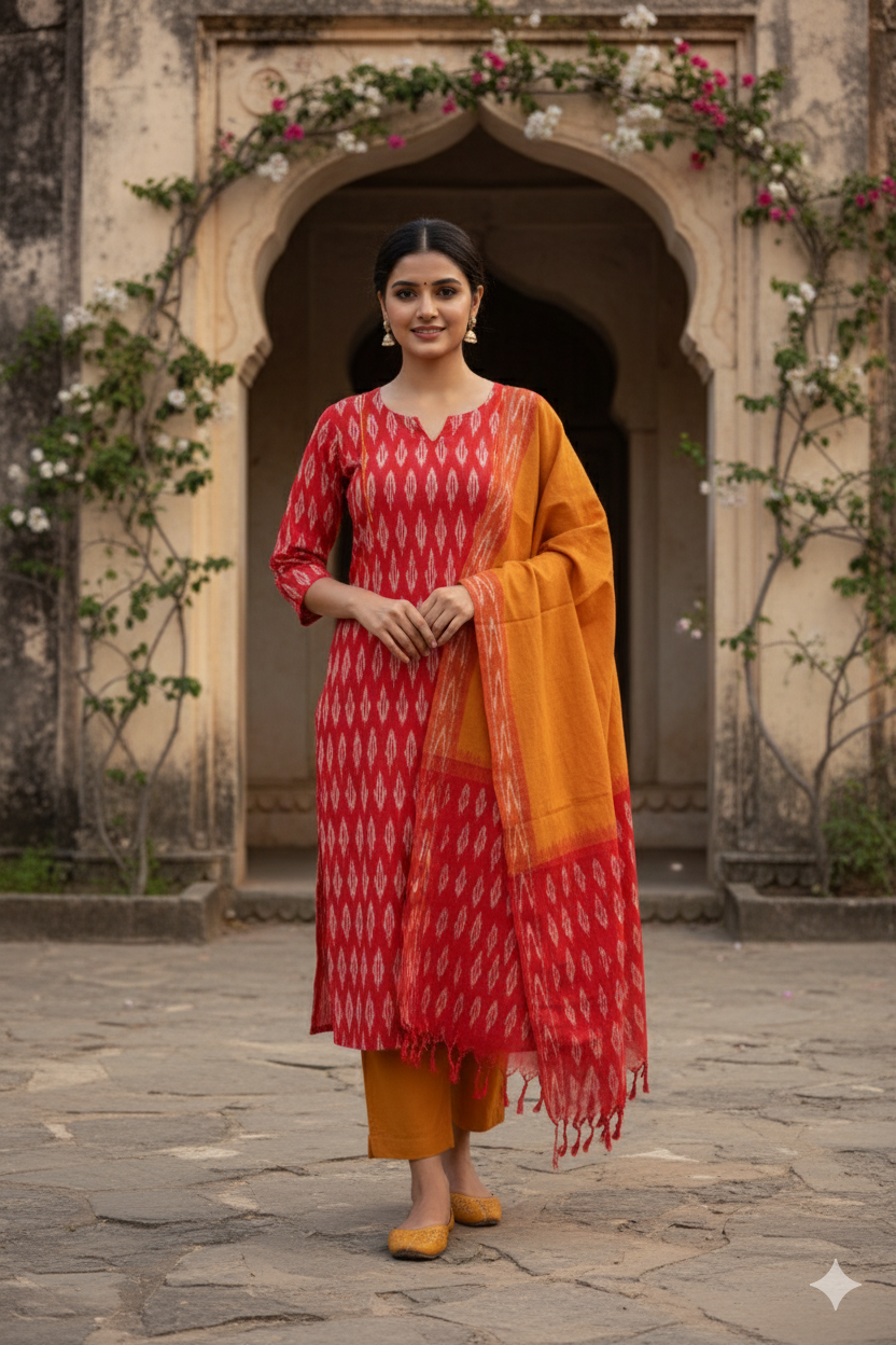 Premium Ikkat 3 Piece Stitched Set – Ready to Wear Kurta, Bottom & Dupatta – Red Colour Handloom Ethnic Wear