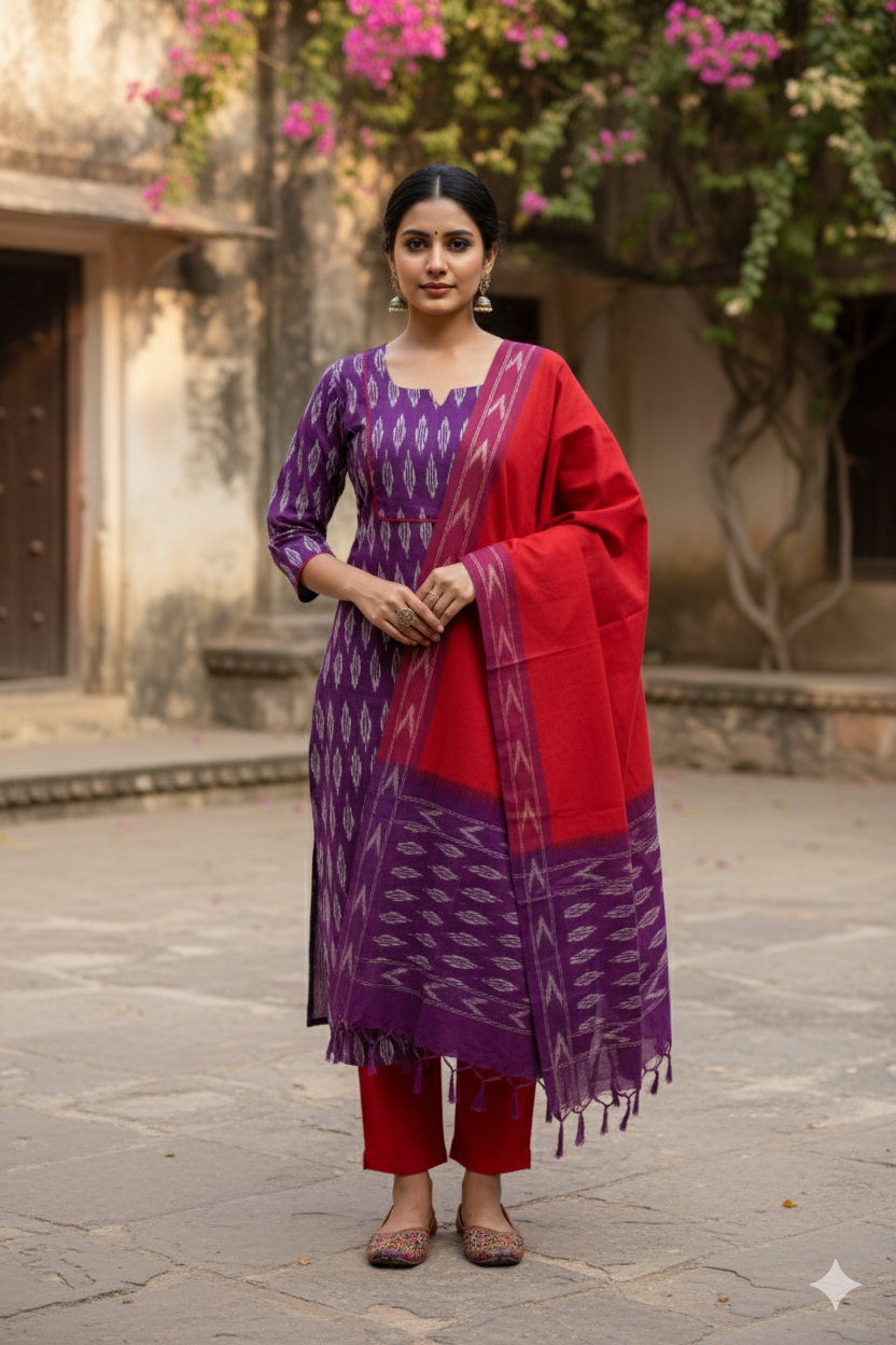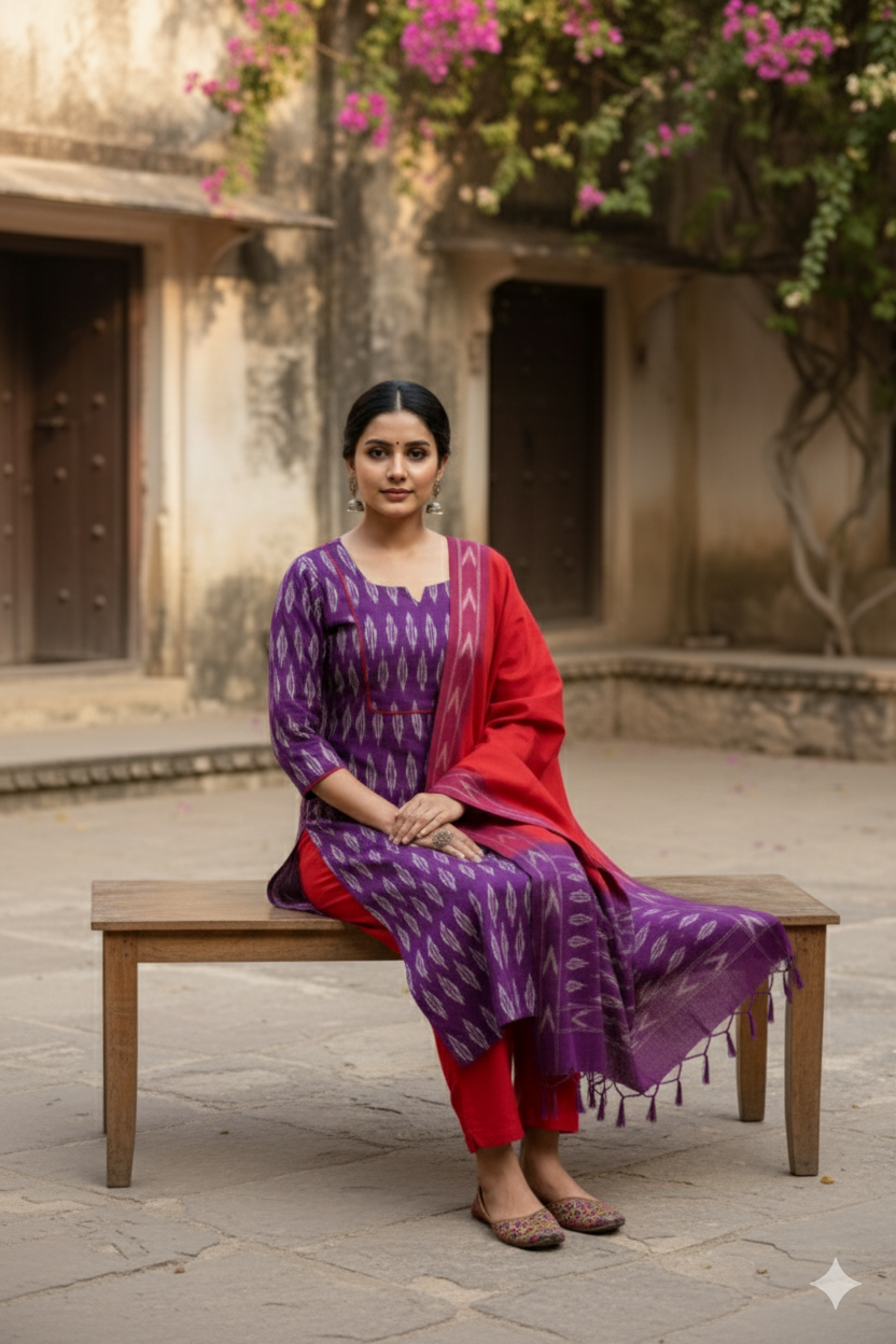Premium Ikkat 3 Piece Stitched Set – Ready to Wear Kurta, Bottom & Dupatta – Royal Lavender Handloom Ethnic Wear