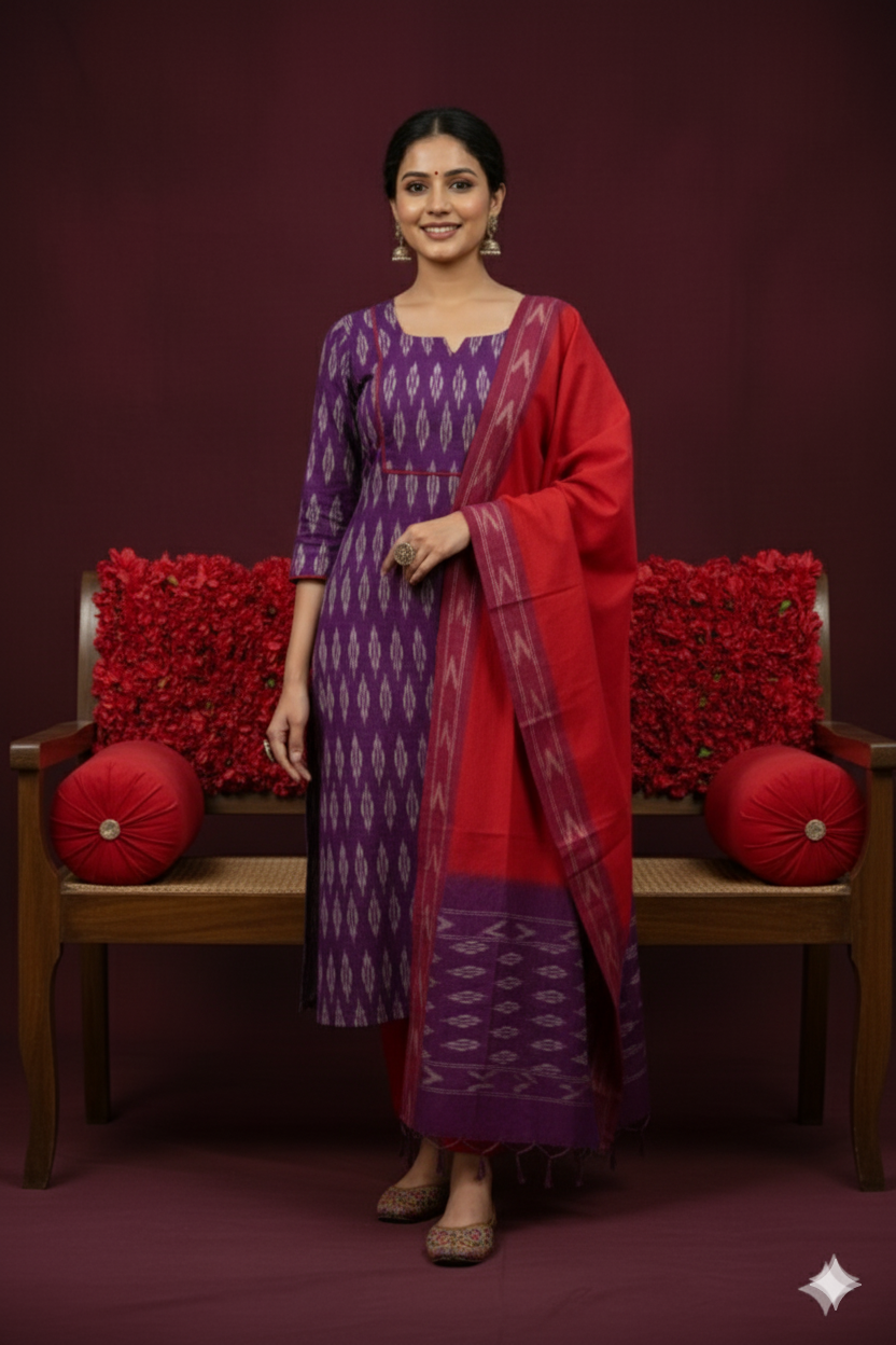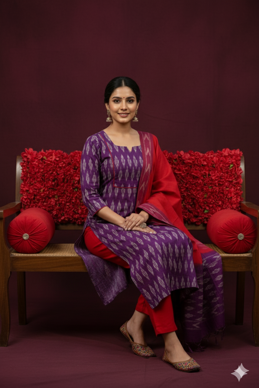 This Ikkat 3-piece set is ideal for festive functions, traditional wear, and ethnic occasions.