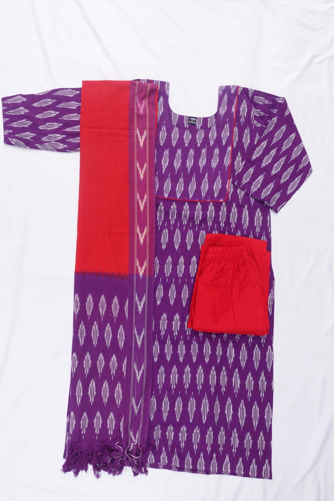 Keywords: Premium Ikkat 3pc Set, Pochampally Ikkat Suit, Handloom Kurta Dupatta Set, Bhavana Originals Ethnic Wear, Full-Length Lined Ikkat Set.